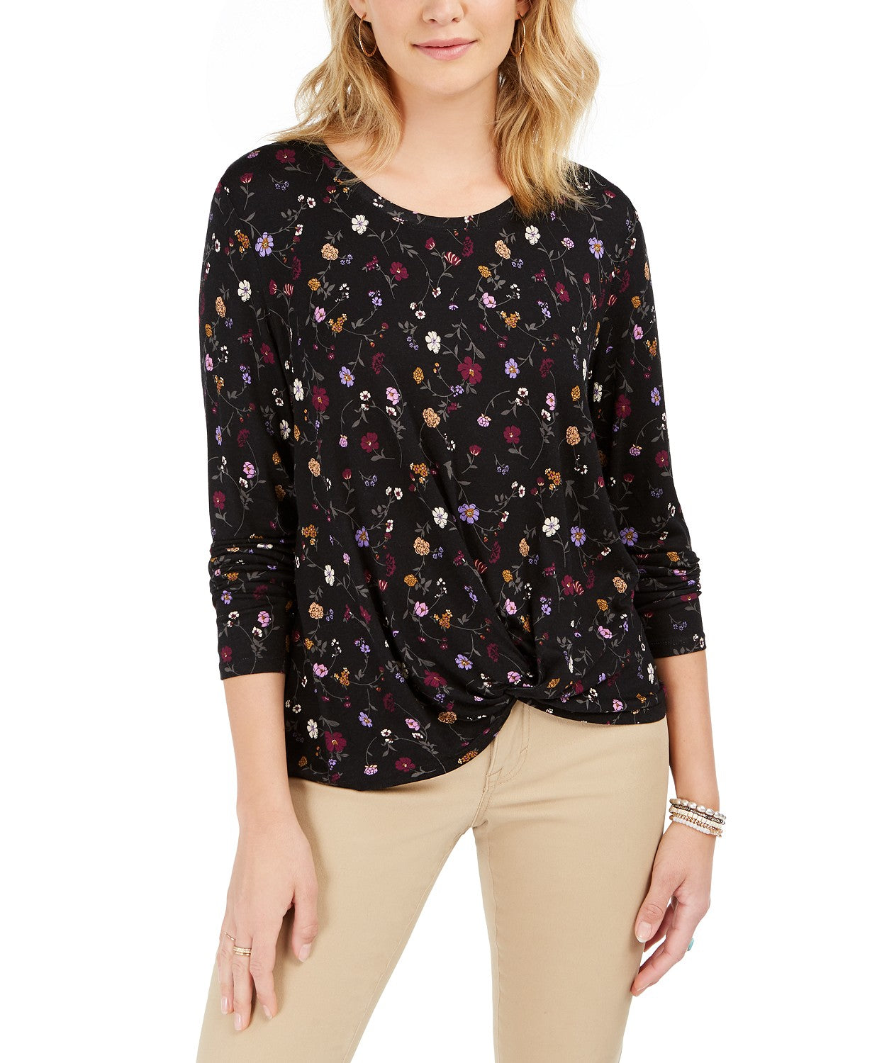 Style & Co Women's Floral-Print Twist-Front Top Black Size Small