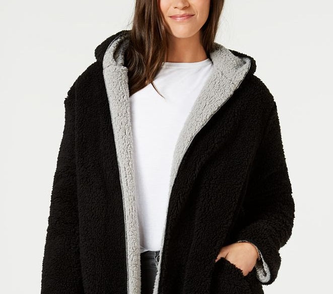 Chase the chills away with Style & Co's cozy faux-sherpa jacket with a self hood and open front - simply turn it inside out to change the look.| Due to generous sizing| we suggest sizing down for the perfect fit| Relaxed fit; hits at mid thigh; approx. length; 32 | Attached self hood; open front with no closure| Reversible