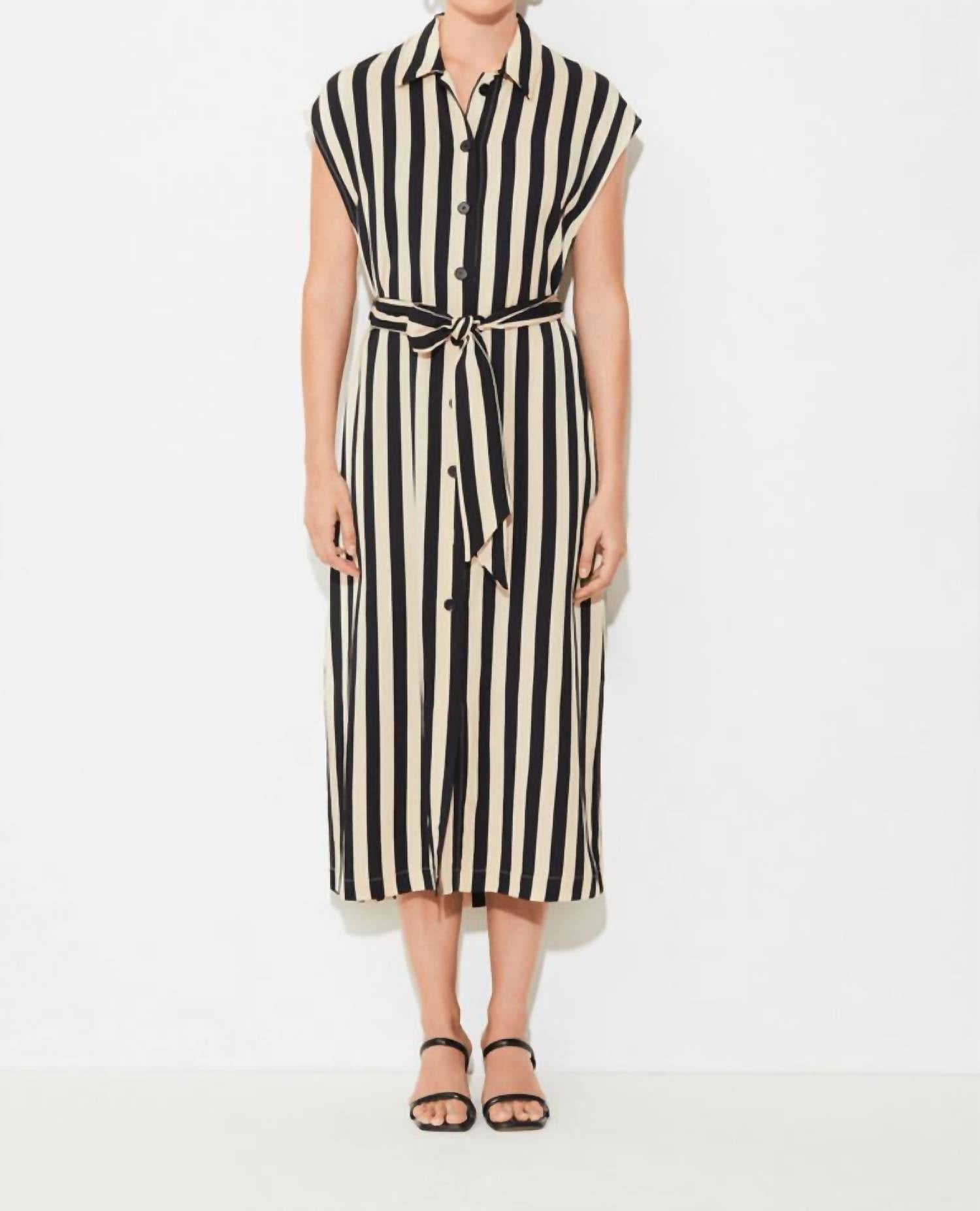 Just add slides or mules and you are good to go. Introducing the Celest Midi Dress by Suncoo, a chic staple crafted for modern workwear. This black striped shirt dress features cap sleeves and a classic shirt collar with a front button closure. Made from a sustainable FSC viscose blend, it includes a removable tone-on-tone belt to tie and two side slits at the bottom for added movement and style. Care instructions recommend hand washing to maintain its elegant design.