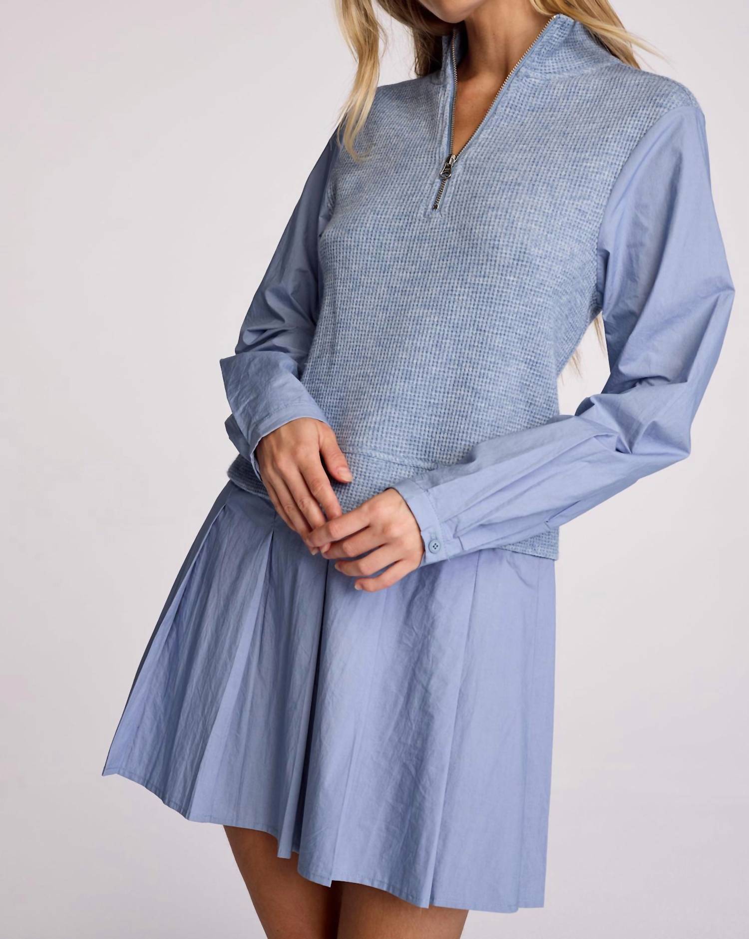 Introducing the Hunter Mini Dress by Sundays, a stylish and modern twist on a classic silhouette. This women's dress in Blue Mist features long sleeves with a chic mockneck, offering a fit and flare shape. Constructed with a blend of polyester materials, it comes with a convenient zip closure for easy wear. Care for this versatile, patterned dress is a breeze with machine wash and tumble dry instructions. Perfect for adding a minimalist touch to your Thanksgiving holiday party ensemble.