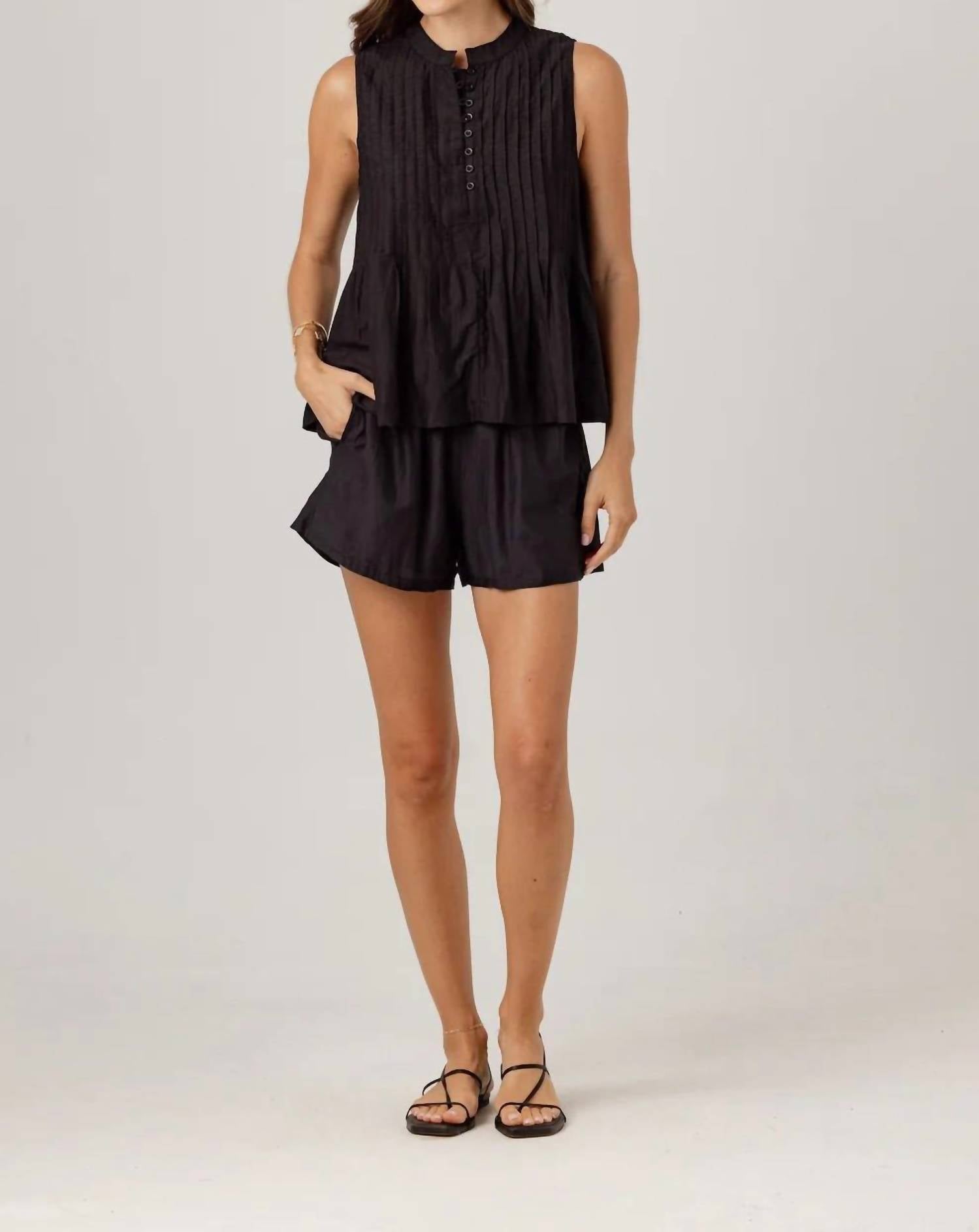 Pair this with your favorite jeans and slides for your next girls night out. Elevate your summer wardrobe with the Lydie Pintuck Top by sundays, exquisitely crafted from a blend of cotton and silk for an effortlessly airy feel. This sleeveless design features a crewneck and a henley style button closure to elegantly frame your neckline. Composition: 80% Cotton, 20% Silk. Care: Delicate wash cold, tumble dry low. The Lydie Top pairs seamlessly with mid-rise bottoms, offering a minimalist and refined look perfect for vacations or celebratory occasions.