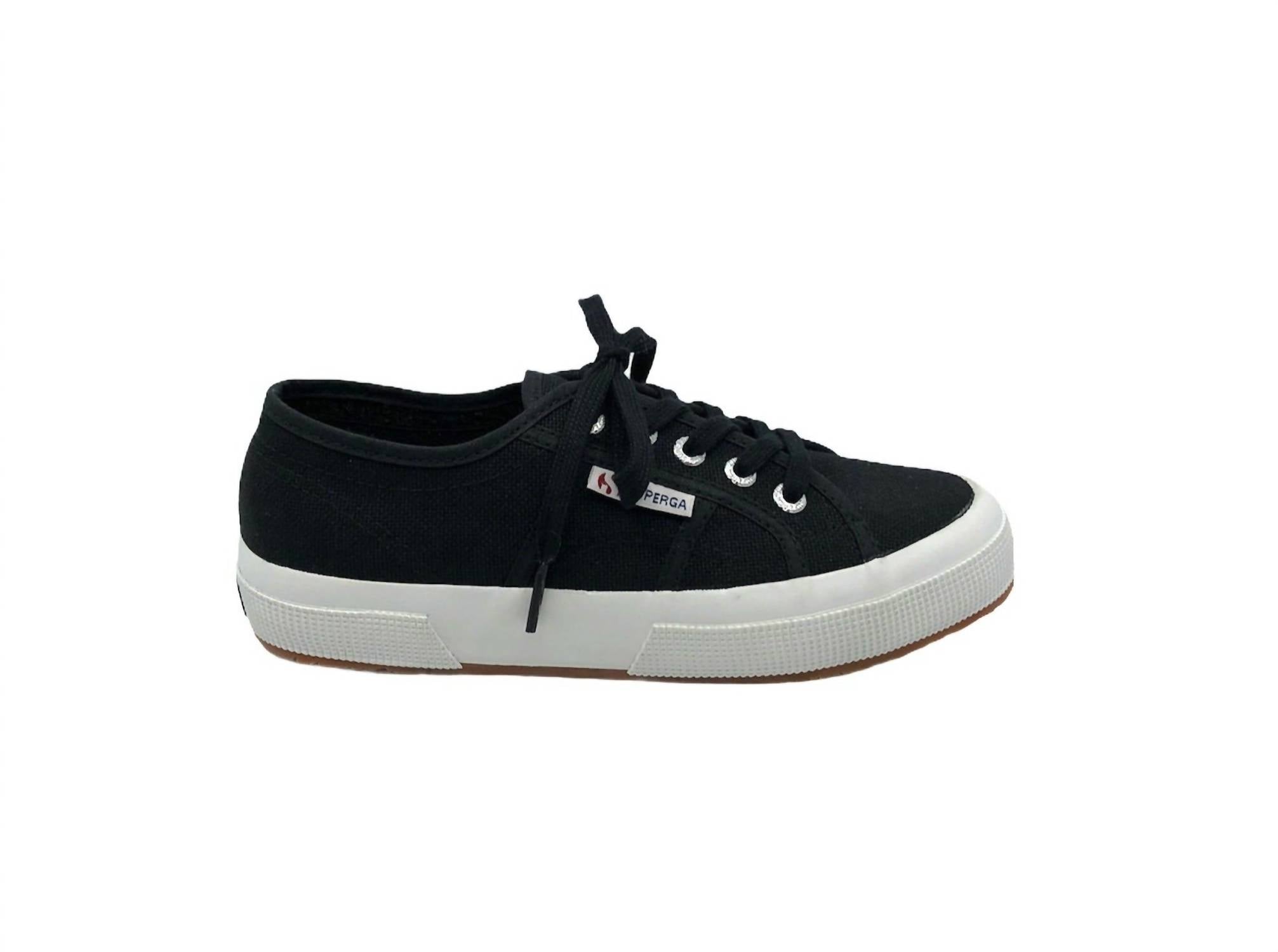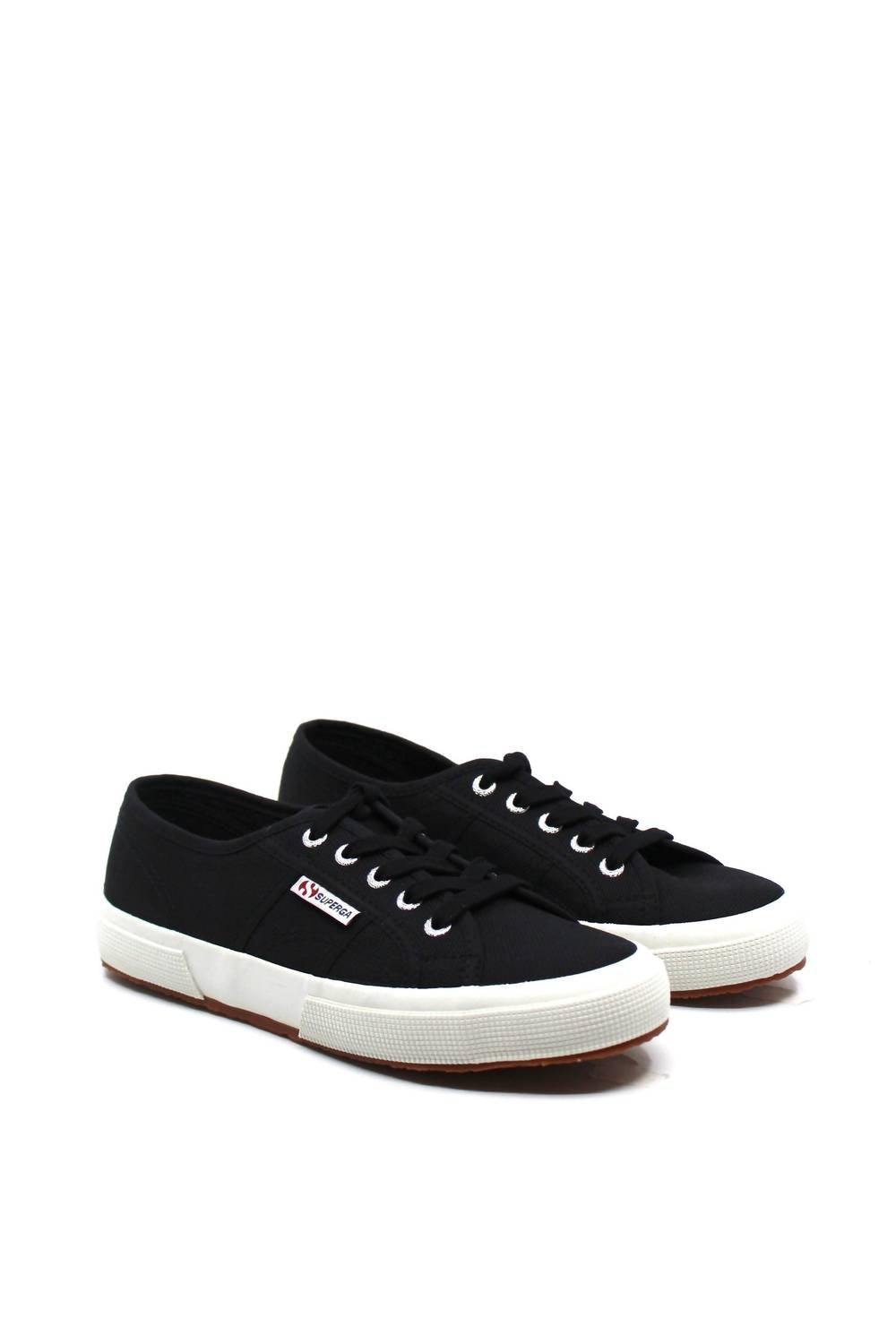 Get your daily steps in with these adorable sneakers. Step out in style with the Women's 2750 Cotu Classic Black Sneakers by SUPERGA, boasting a timeless design perfect for any wardrobe. These sneakers feature a sturdy cotton unlined canvas upper in a sleek black hue and a lace-up closure with metal eyelets for an adjustable fit. Enjoy all-day comfort with a cushioned footbed, while the natural rubber, crepe-textured outsole ensures traction and durability. Platform height is approximately 1", showcasing a flat heel design that pairs effortlessly with denim or dresses alike.