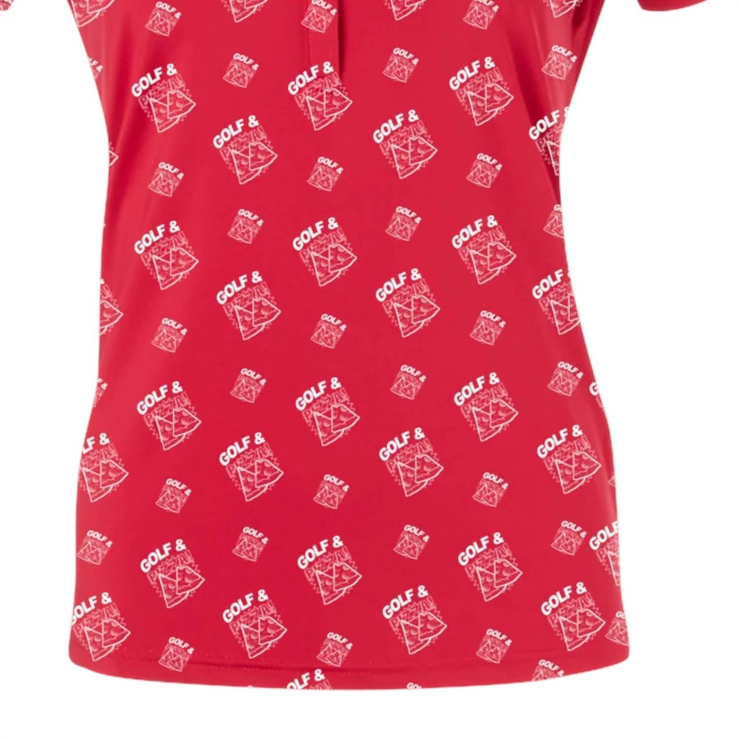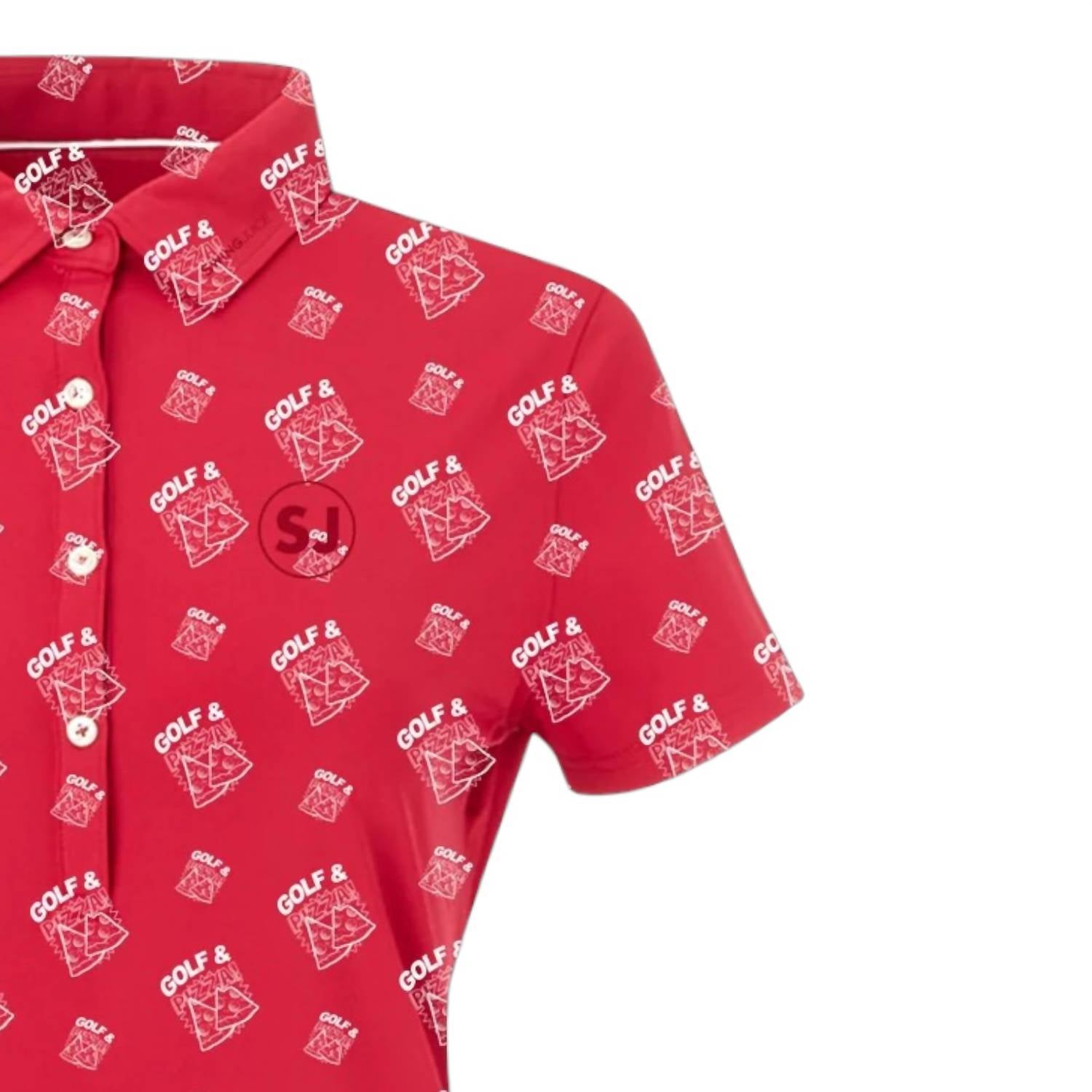 This classic, short sleeve tee will be your go-to staple this season and beyond. Introducing the Women's Golf & Pizza Polo by SwingJuice, a playful piece in vibrant red with a unique pizza-themed print. This short-sleeve polo features a ribbed collar and a four-button narrow placket, offering both style and functionality. Made from bamboo charcoal infused 92% micro polyester and 8% Spandex, it provides a quick dry finish, natural odor resistance, and UPF 50+ sun protection. Care instructions include machine wash cold and tumble dry low.