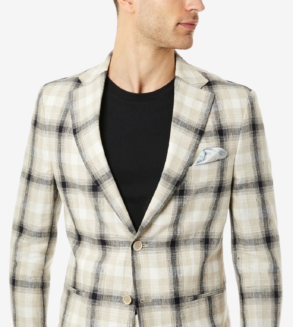 Tallia Men's Slim Fit Cream & Black Plaid Linen Blazer Black Size 44