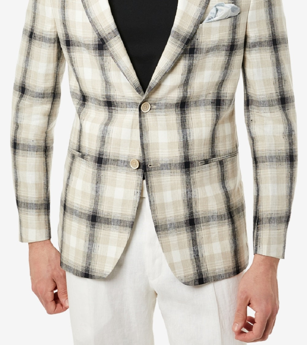 Fashion-conscious men will appreciate the refined design and striking cream and black plaid pattern adorning this distinctive slim-fit blazer from Tallia. | Slim fit through the shoulders| chest and waist with higher armholes and slimmer sleeves| Notch lapel| Two-button closure| Three front besom pockets| Side vents