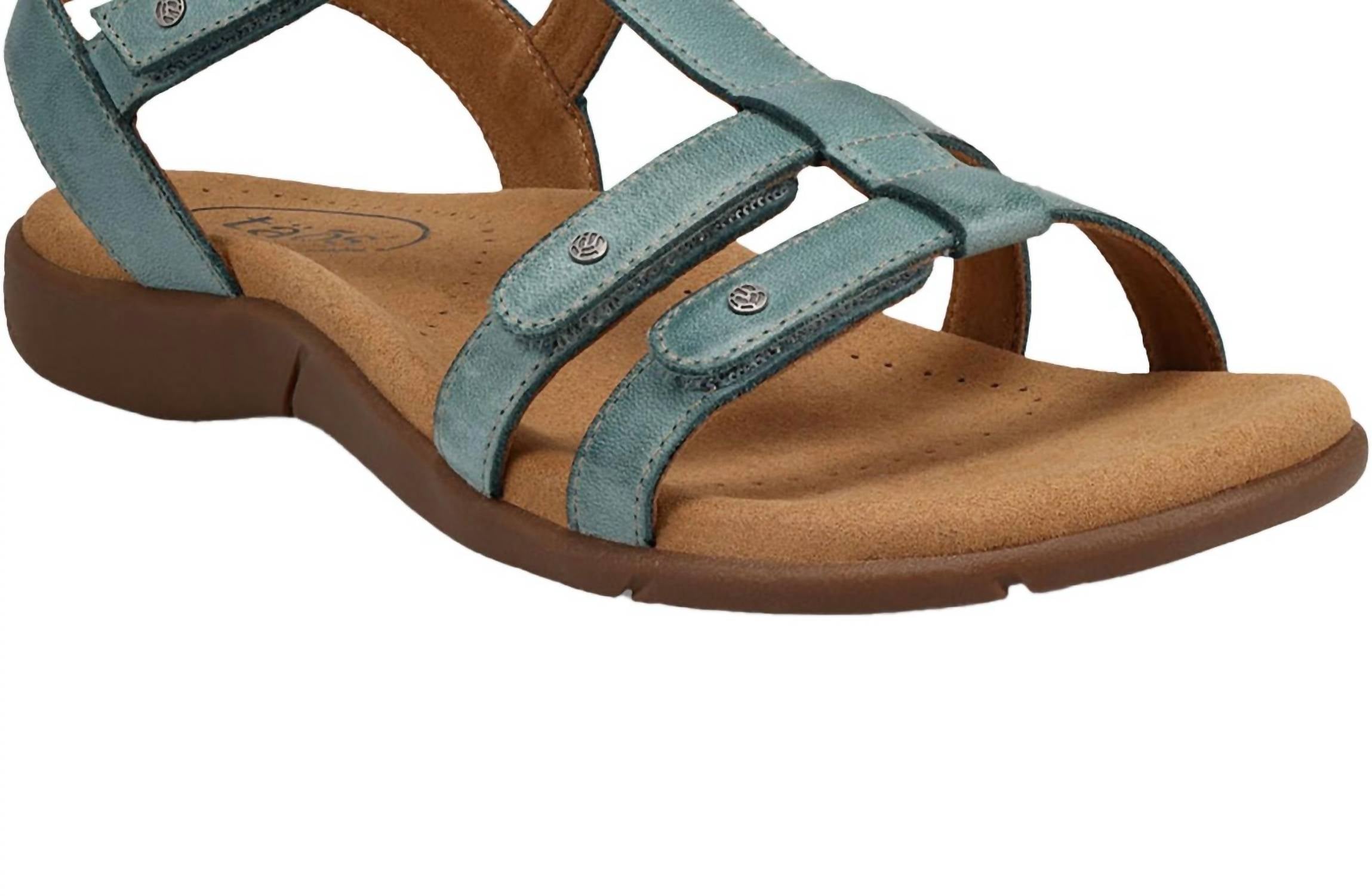 Flowy dresses, cropped pants, and even jumpsuits... this sandal works with them all! Introducing the Taos Women's Trophy 2 Sandal, a chic option for summer getaways in a vibrant teal hue. Crafted from smooth leather, this sandal features an open toe design and three adjustable hook and loop straps, ensuring a comfortable fit. The premium footbed is equipped with Cool Recovery Foam, arch support, forefoot cushioning, and metatarsal support for all-day comfort. A flexible and durable rubber outsole supports a flat heel height of 1 inch.