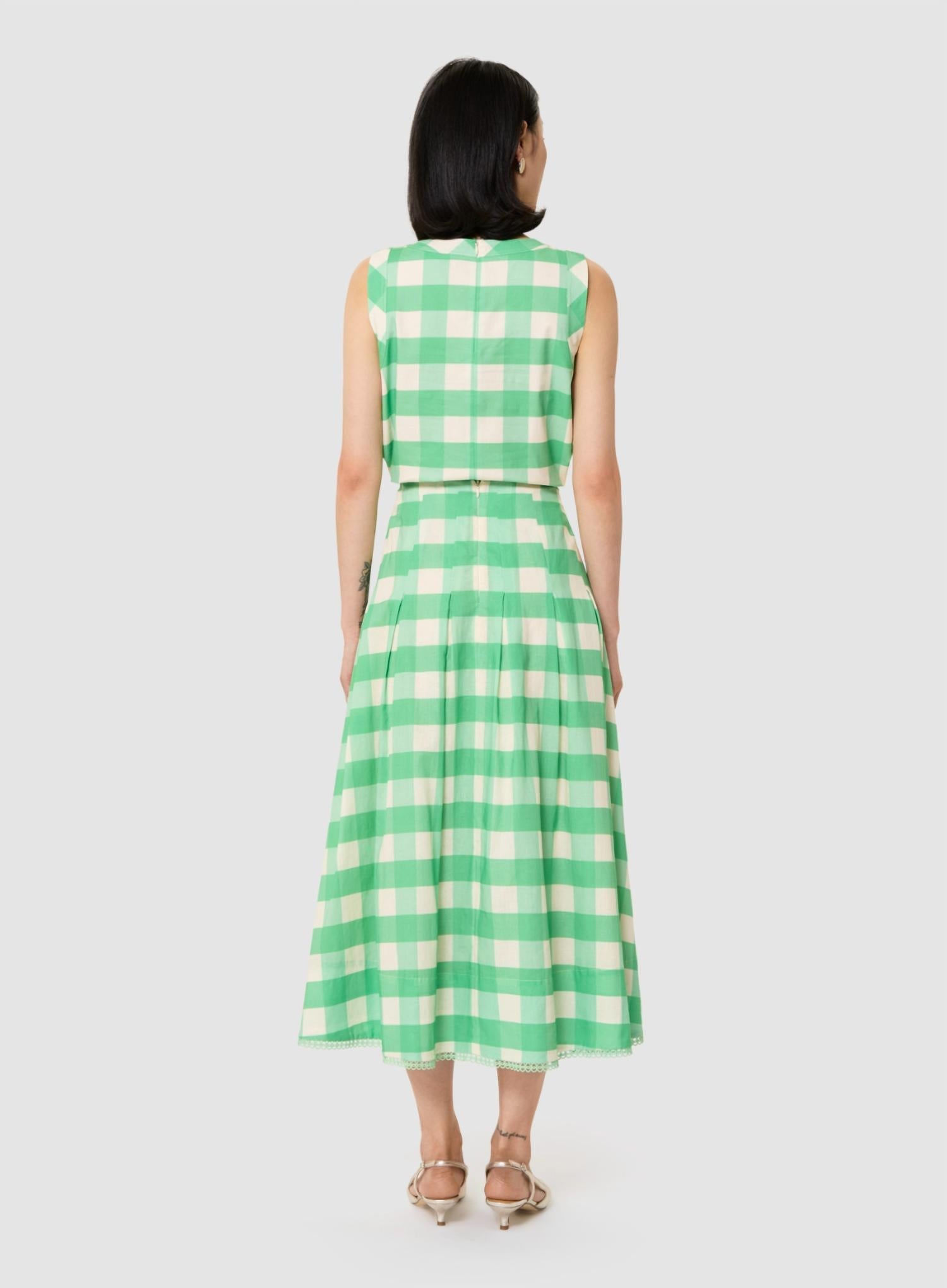 The midi length skirt is here to stay and we especially love this style. Introducing the Javoue Gingham Midi Skirt by TARA JARMON, a charming piece in a refreshing green hue perfect for adding romance to your wardrobe. This high-waisted, long skirt features an ultra-romantic ruffled cut in XXL gingham, complete with a sophisticated tone-on-tone lace scallop at the bottom. Crafted from 55% linen and 45% cotton with a lining of 65% polyester and 35% cotton, it boasts French craftsmanship. Closure: Invisible zip at the back. Care: Dry clean only.