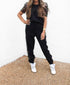 Elevate your night out with the Dine Or Dash Set by TCEC, a stunning loungewear ensemble in classic black. The top boasts short sleeves with a stylish stripe pattern, while gold sequins add a touch of glamour to the overall design. The joggers feature a sid stripe and tapered silhouette, making them perfect to pair with heels for a chic look. Seamlessly blending comfort with elegance, this pull-on set is your go-to for stylish evenings.