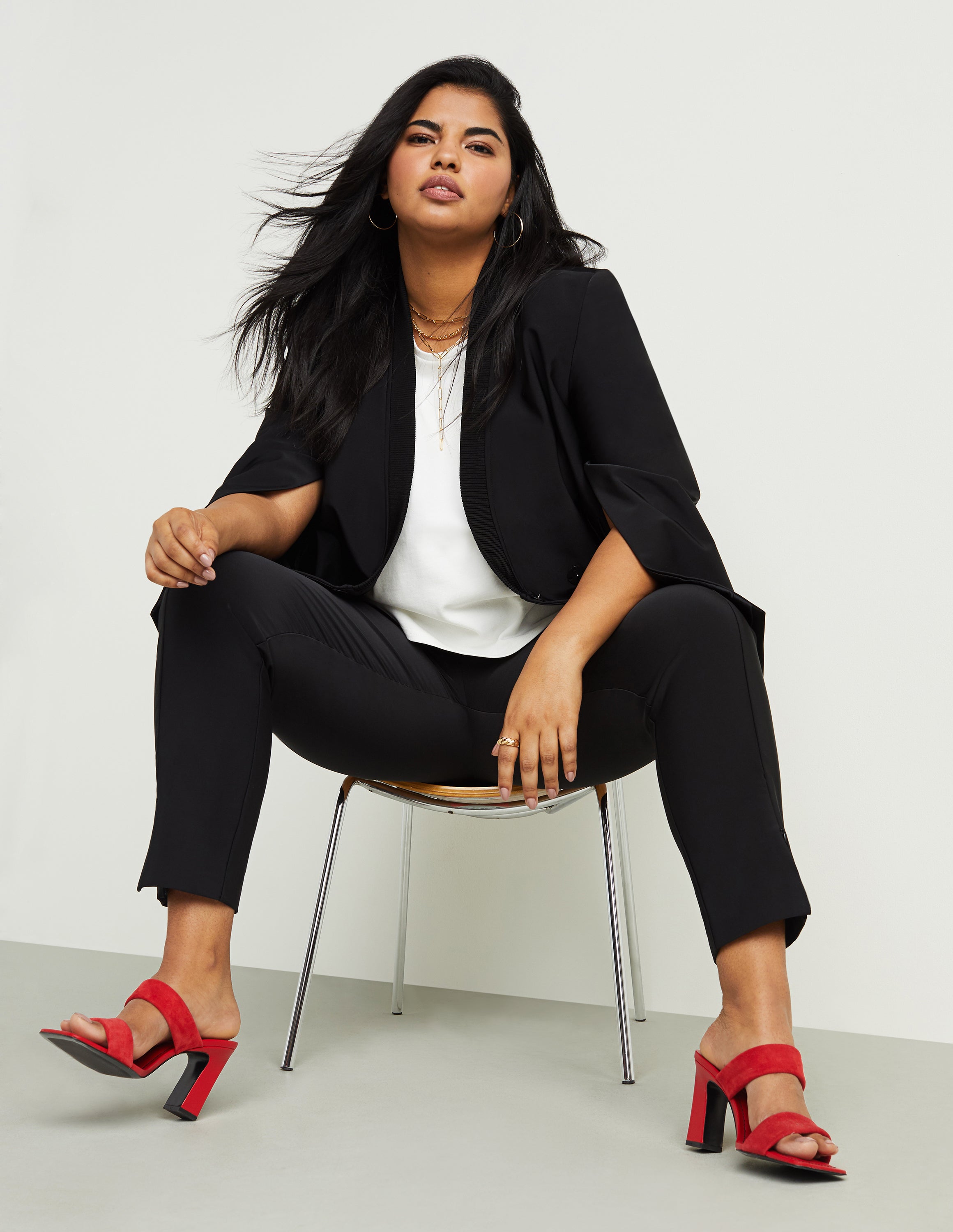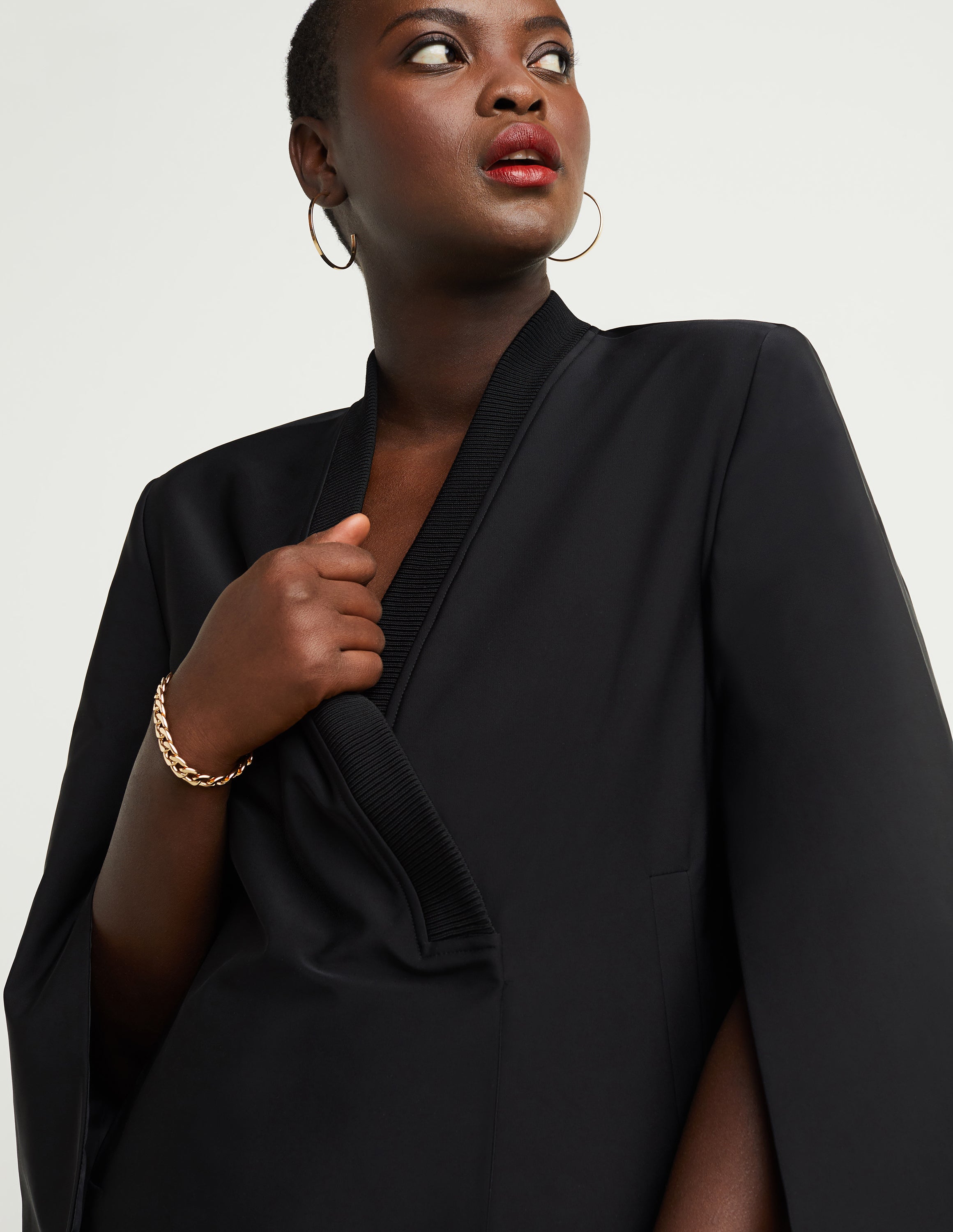 Serious swagger. This double-breasted blazer is designed with super comfortable stretch fabric—delivering pure confidence in motion. A touch of drama comes into play with long, slit sleeves and a form-fitting, wrap front that serves up a shapely silhouette.