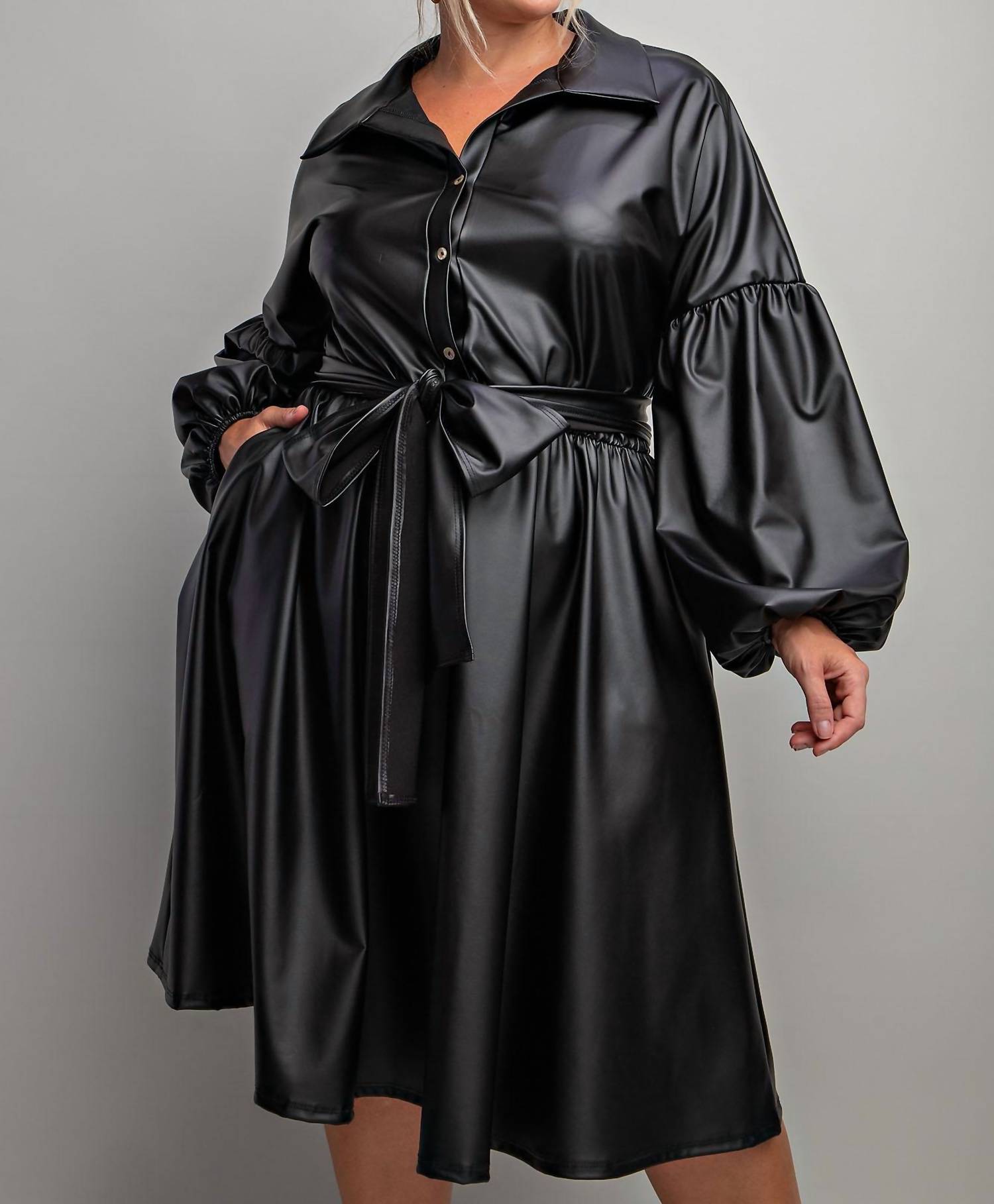 The Curve LA presents the Plus Size Faux Leather Button Front Fit Flare Dress, a chic addition to any evening wardrobe. This midi-length dress features long puff sleeves and a basic collar, creating a striking silhouette enhanced by the fit and flare design. Tailored with a button-front closure, it includes a removable sash belt and practical side pockets. Made in the United States from solid black faux leather, this dress effortlessly combines style and comfort.