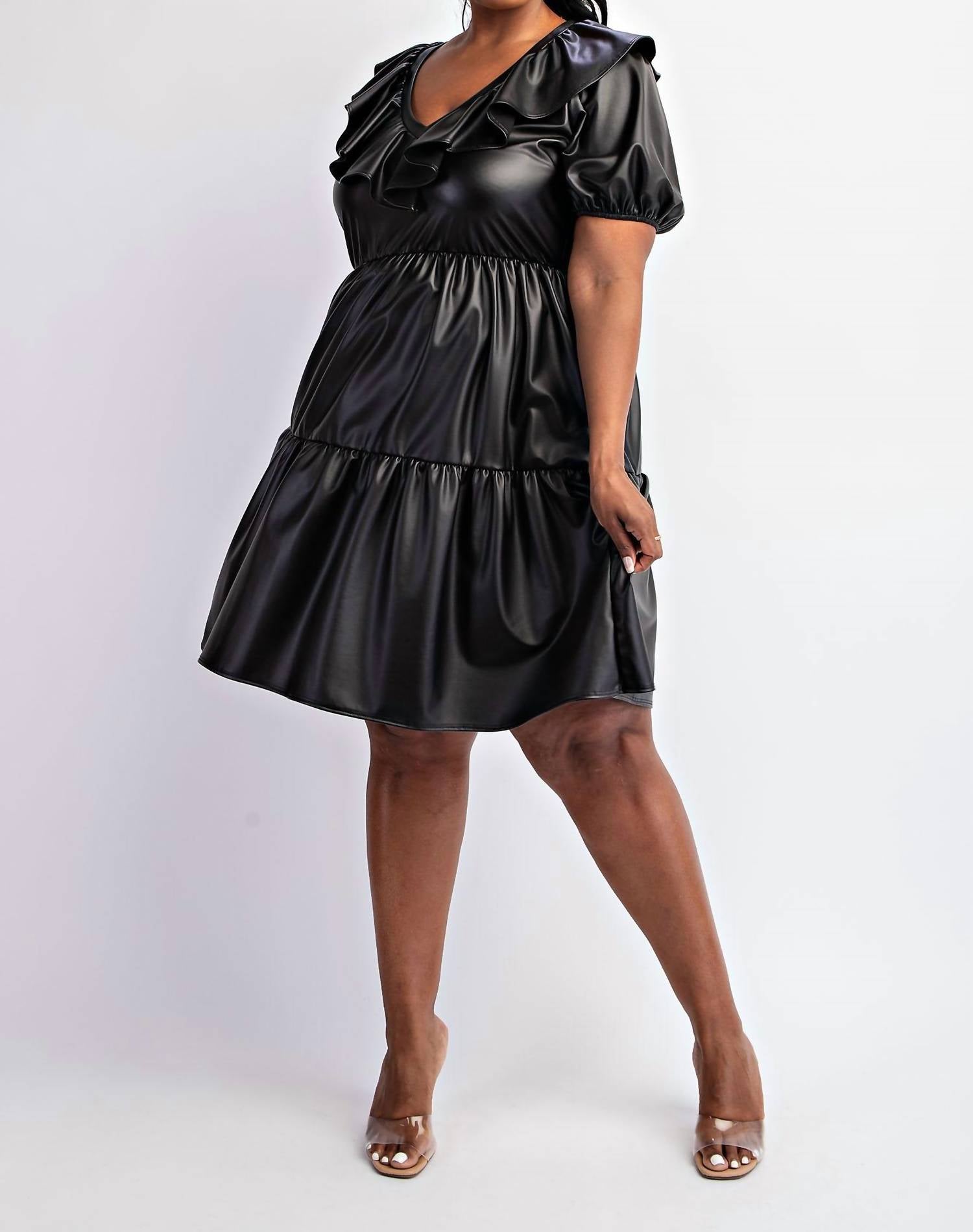 The Curve La - Plus Size Faux Leather Tiered Puff Sleeve Short Dress