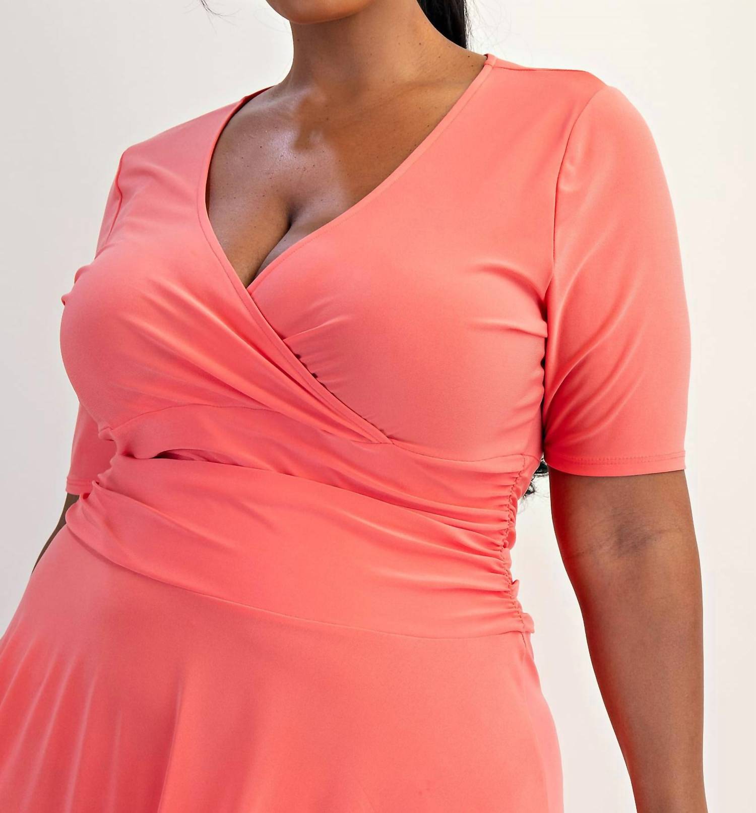 A midi dress so versatile, your options for wearing it are endless. Introducing the Plus Size Knit Surplice Midi Dress by The Curve LA, a sophisticated choice for evening events. This solid black dress features a surplice V-neckline and short sleeves, enhancing its fit and flare silhouette. Made in the United States, it effortlessly combines style with comfort and offers a flattering ruched waist. Closure is a convenient pull-on style, and it's easy to care for with machine wash instructions.