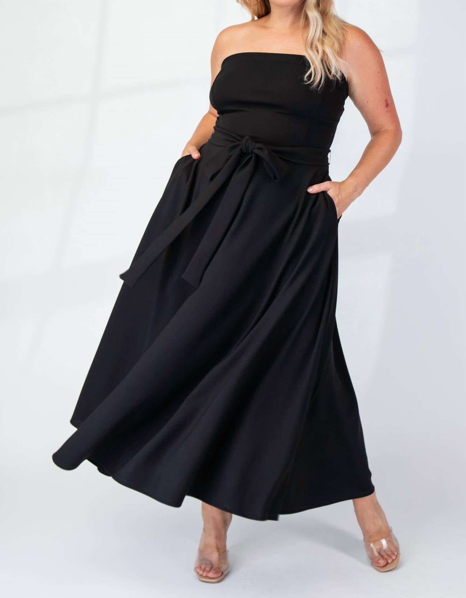 A strapless dress so versatile you can dress it up with heels or wedges, or give off a more casual vibe with flats. Discover the Plus Size Knit Tube Maxi Dress with Self Belt by The Curve LA, a stunning addition to your wardrobe in vibrant red. This strapless A-line dress features a flattering squareneck with a self-tie sash, accentuated by practical front pockets. Made in the United States, this solid-patterned piece offers a chic pull-on closure for seamless wear. Easy to care for, simply machine wash to maintain its fresh look, perfect for springtime dinner parties or special occasions.