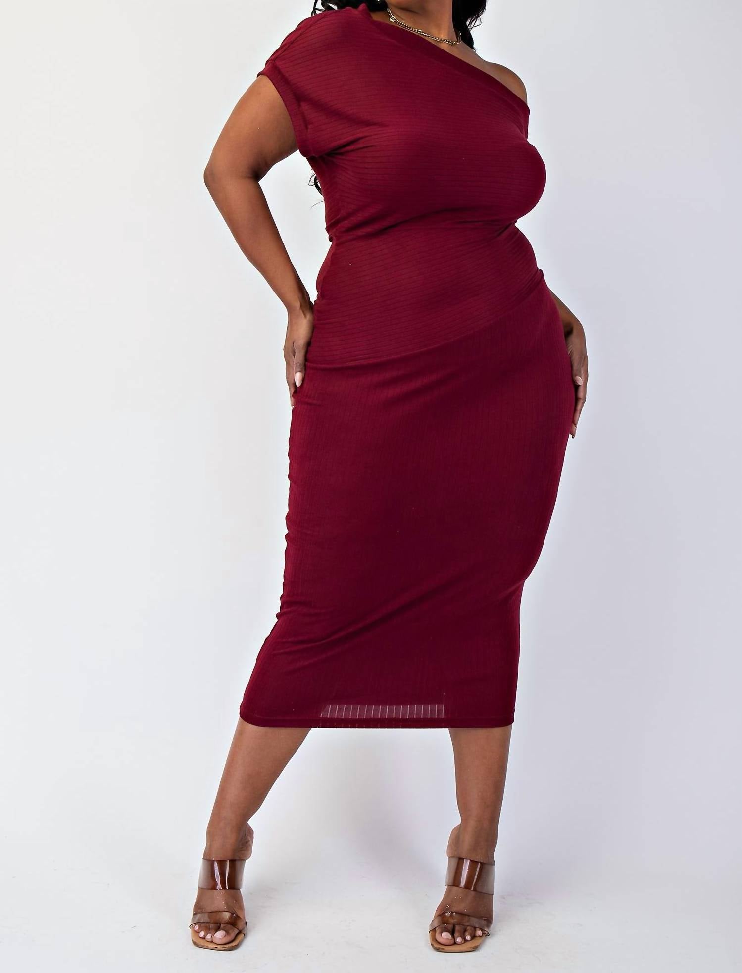 Just add slides or mules and you are good to go. Introducing the Plus Size Ribbed Knit Off Shoulder Midi Dress by The Curve LA, perfect for a dinner party or Thanksgiving gathering. Crafted in the United States, this fall dress features a soft ribbed knit composition with a stylish off-the-shoulder boatneck and short sleeves. Its bodycon silhouette is both flattering and chic, designed to highlight your curves. Closure: Pull-on style. Care: Machine wash. Available in a striking rust color for an undeniable statement.