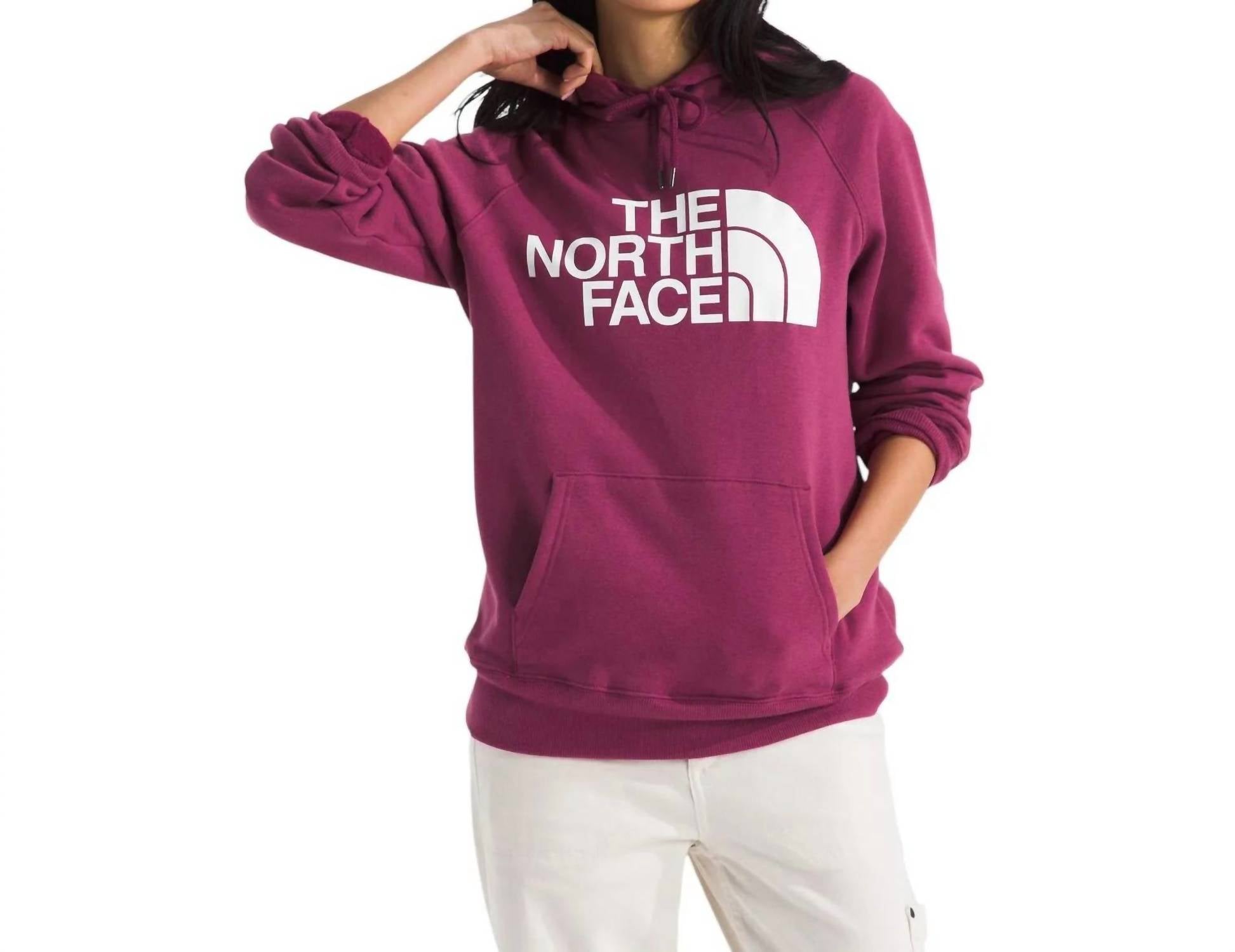 Whether you're running around town or lounging at home, this sweatshirt works for both. The Half Dome Pullover Hoodie by THE NORTH FACE, in a vibrant Cyber Berry hue, is an ideal choice for travel and spring adventures. Featuring long raglan sleeves for enhanced mobility, this hoodie is crafted from a blend of cotton and polyester, offering both comfort and sustainability. With a pull-on closure, it comes complete with a two-piece adjustable hood and a convenient kangaroo pocket. This graphic hoodie is machine washable and requires line drying for care.