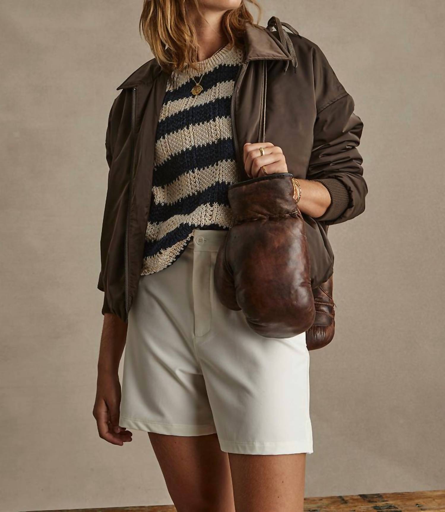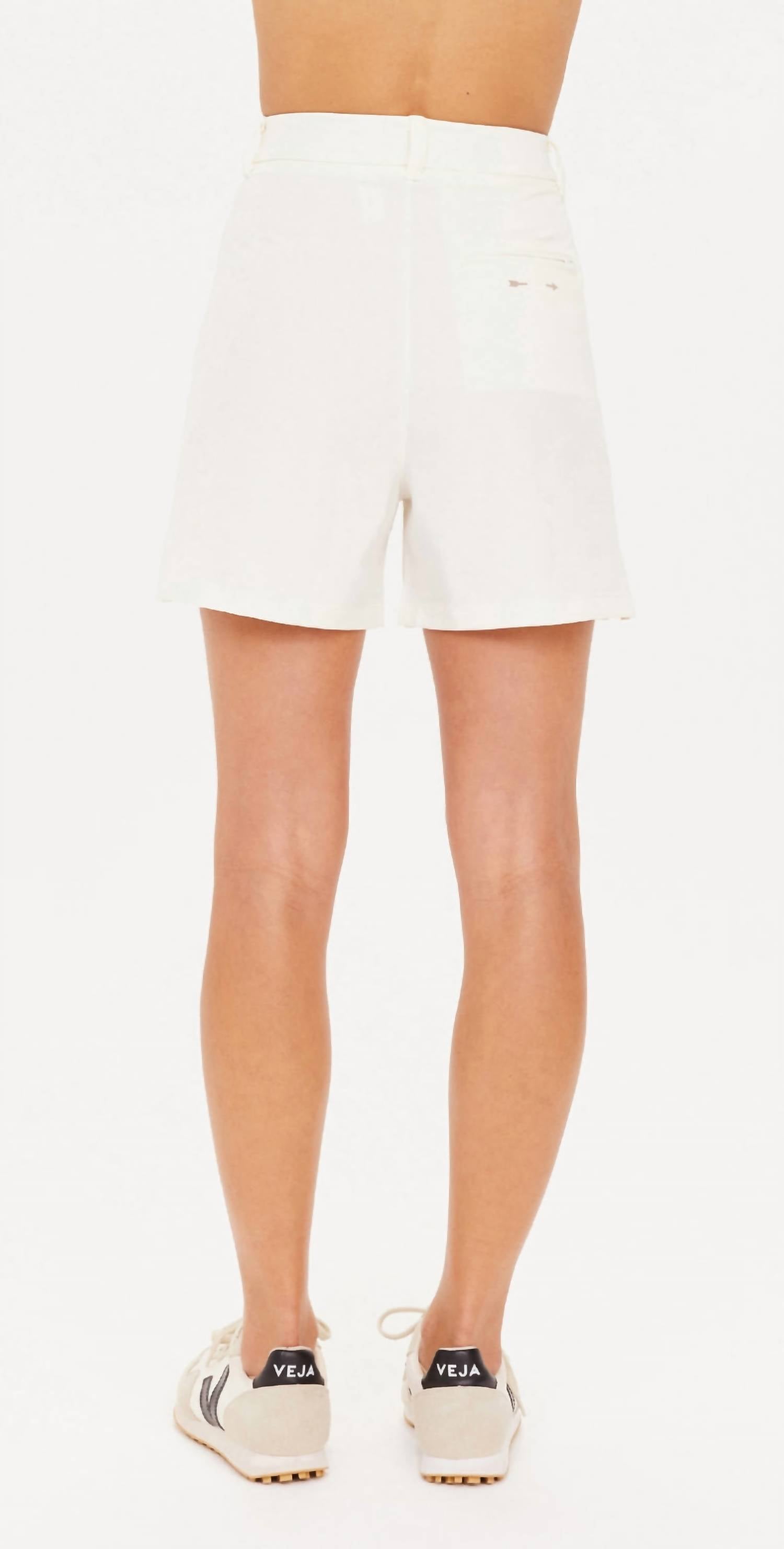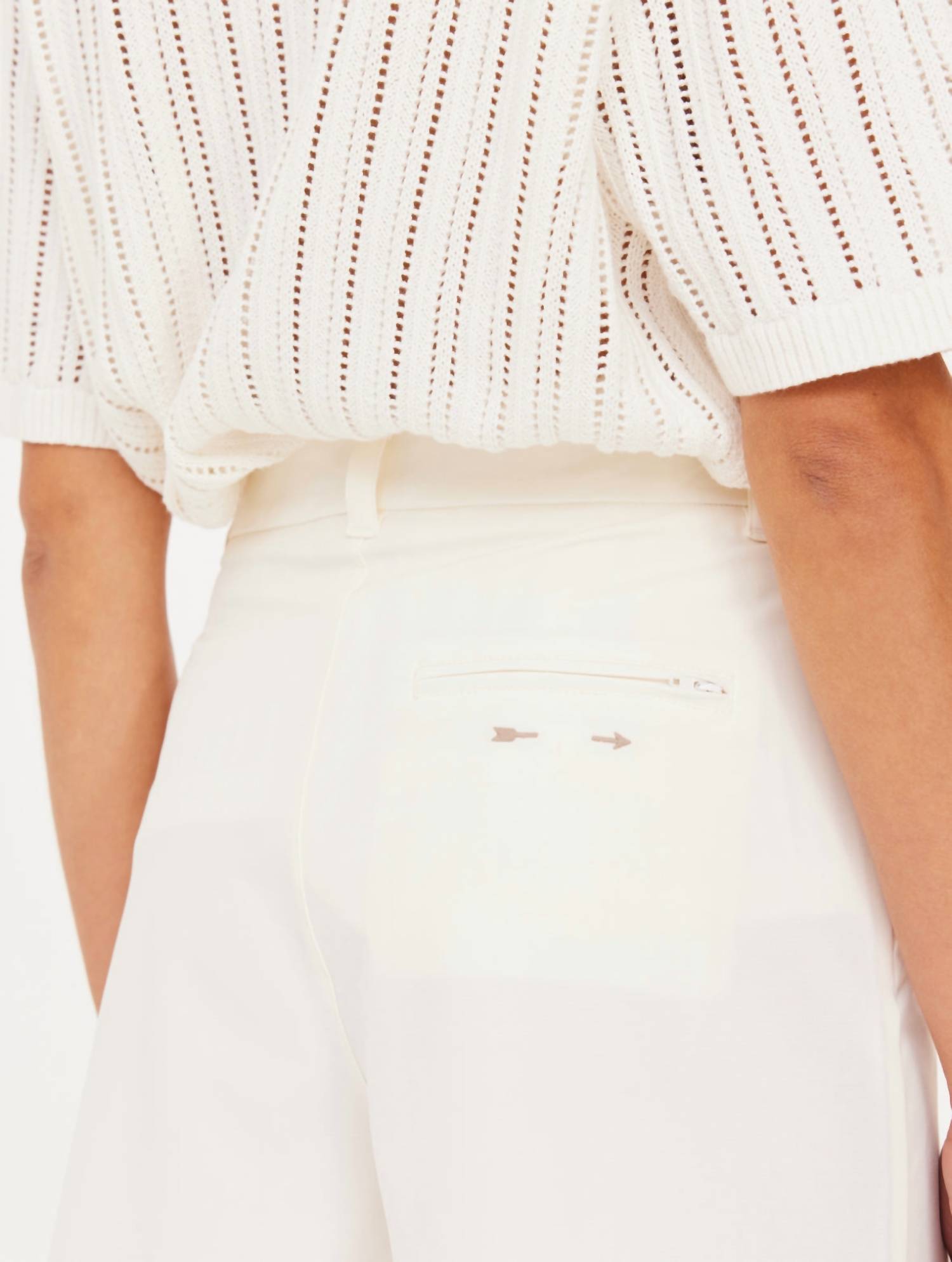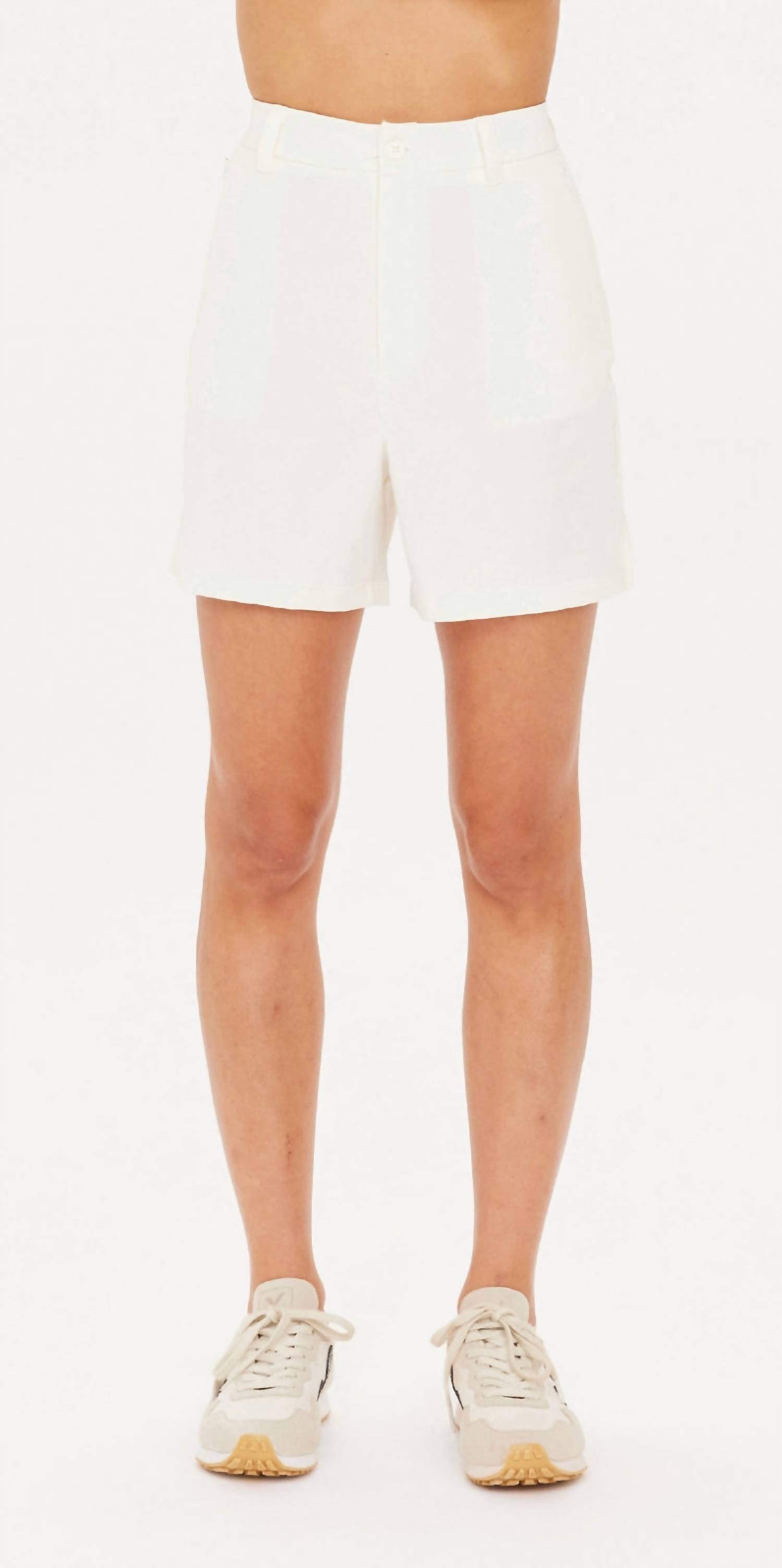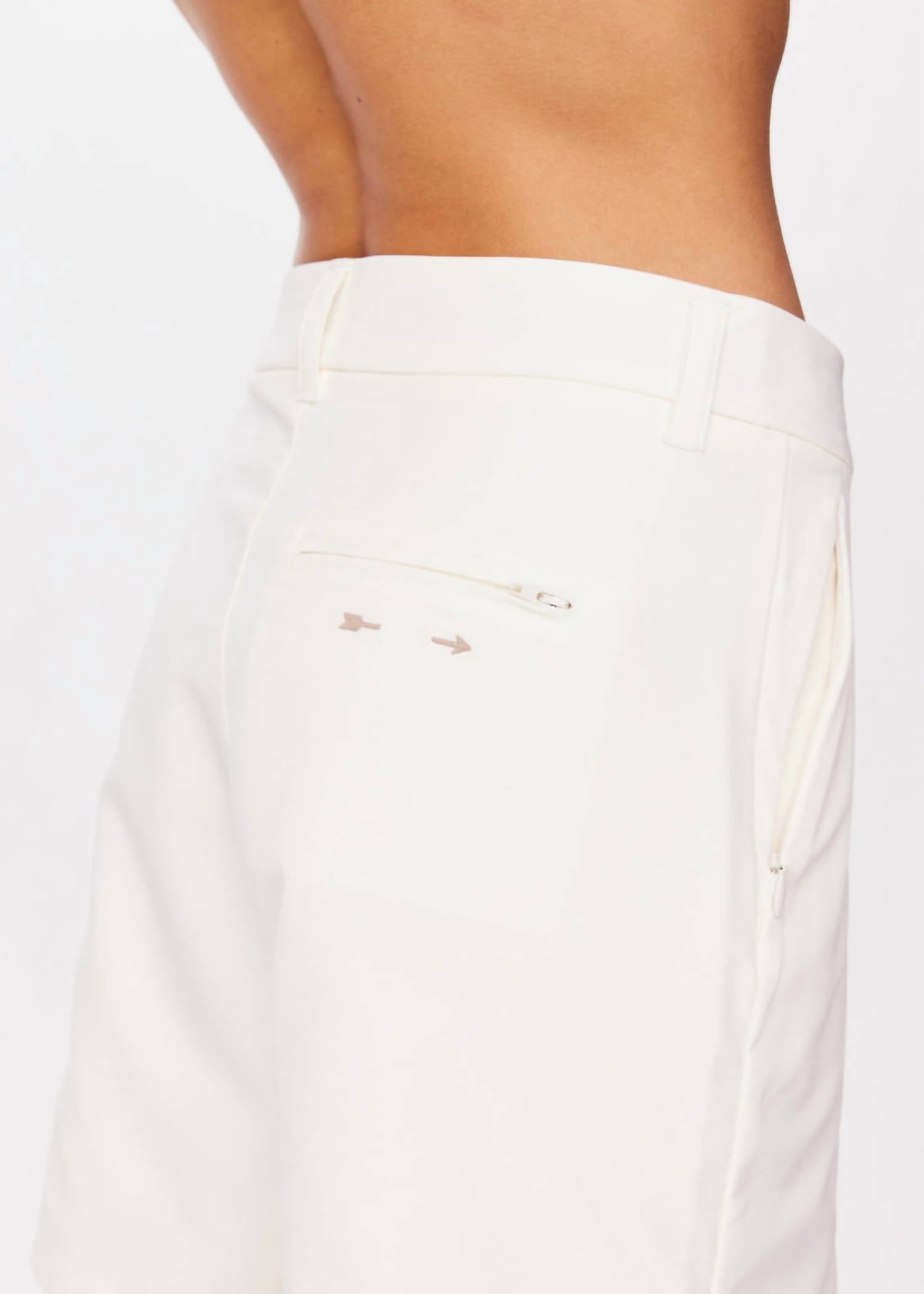 Fit to perfection, we love these high-waist shorts and you will too. Introducing the Wyatt Short by THE UPSIDE, designed for women who seek comfort and style on the course. Featuring a technical longer line design, these solid white shorts are crafted from recycled polyester elastane with moisture-wicking properties for a dry fit. Closure is provided by a convenient hook-and-eye and button fly, with both front and back zip pockets for secure storage. Care instructions include machine washing and line drying to preserve quality and longevity.