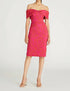 Introducing the Eveline Off Shoulder Dress by THEIA in a striking petunia hue, ideal for your next dinner party. This stylish off-the-shoulder cocktail dress features a fitted sheath silhouette with a floral embossed jacquard design. The dress is knee-length, measuring approximately 26.5" from waist to hem, and is secured with a back zip closure for a seamless fit. It offers elegance with easy maintenance, requiring dry cleaning to maintain its beauty.