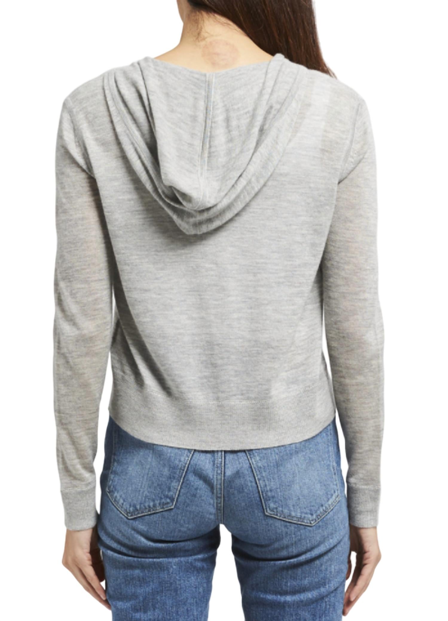 Cooler temps call for layering and we love this adorable sweatshirt for all the obvious reasons.Lightweight light grey melange knit hoodie with classic style and luxurious cashmere fabrication. Zip up. Fabric: 100% Cashmere.