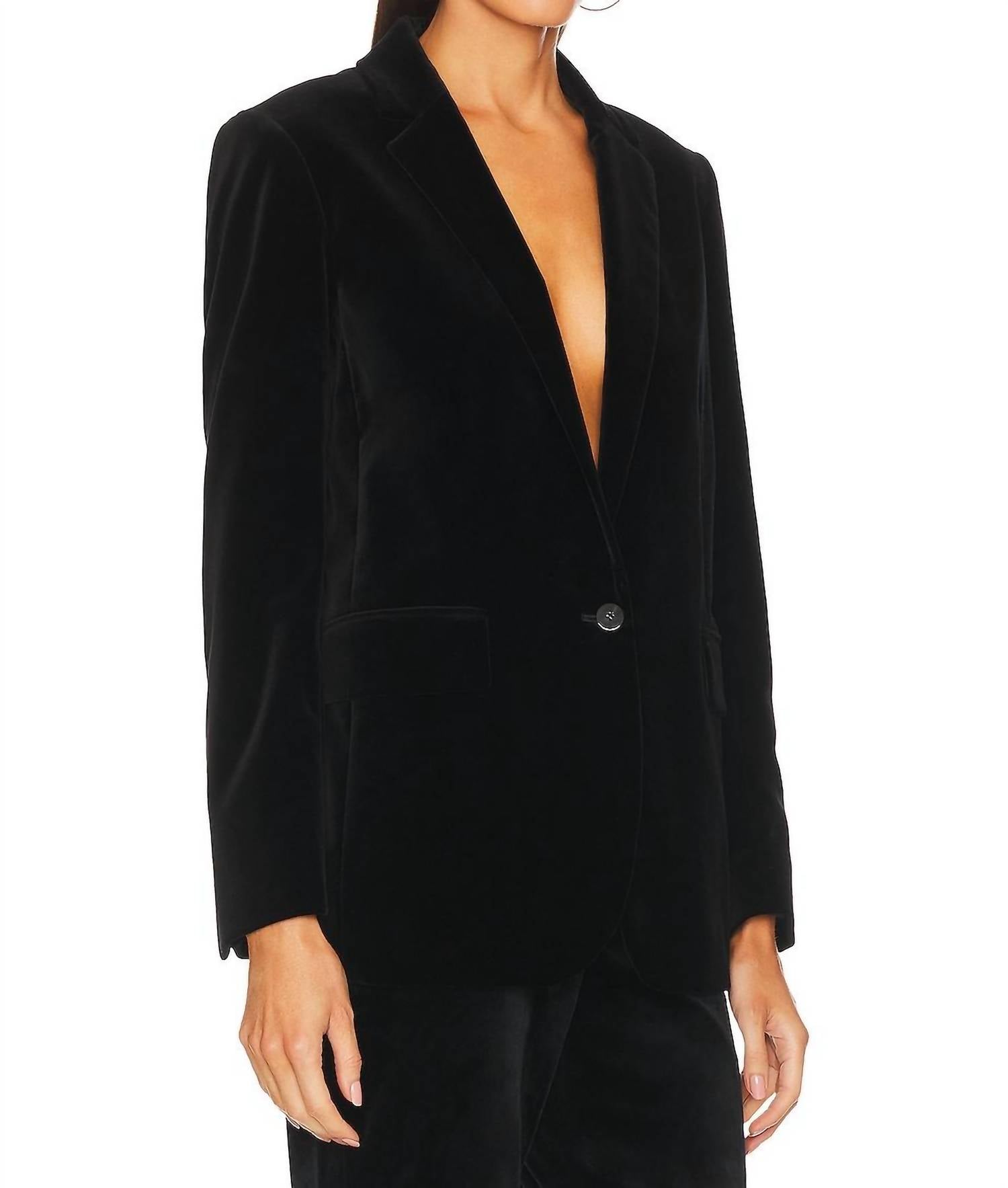 A blazer so versatile you can wear it to the office or pair it with jeans for a more casual look.Unique front button closure. Front flap pockets. Notched lapels. Lightly padded shoulders.Midweight velvet fabric. Polyester blend. Dry clean recommended. Made in Vietnam. Model is 5'10.5" and is wearing a size 2.