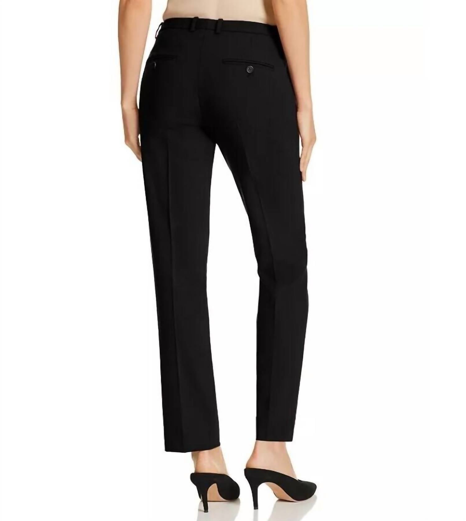 Banded waist, belt loops. Zip fly with hook-and-bar and button closures. Flat front, darted back. Side slit pockets, back button-slit pockets. Center-leg creasing, straight-leg silhouette. Ankle length, stretch-wool construction. Materials: 96% Virgin Wool 4% Elastane; Pocket lining: Polyester/Polyurethane. Dry clean. True to size. Model is 5'10" wearing a size 0.