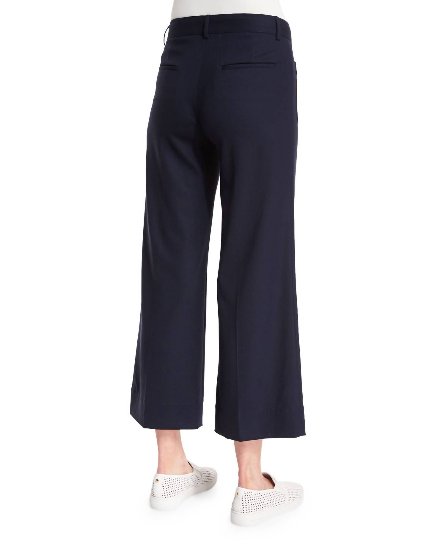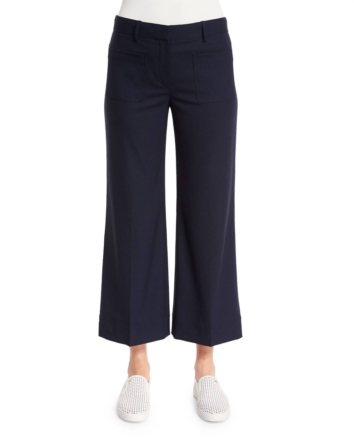 Front patch pockets. Back welt pockets. Wide legs fall from knees. Cropped above the ankle. Tab closure and zip fly. Belt loops. Materials: 100% Virgin Wool. Lining: 100% Polyester. Dry clean. Approx. measurements: 11" rise; 27" inseam; 37" outseam; 11.5" leg opening.