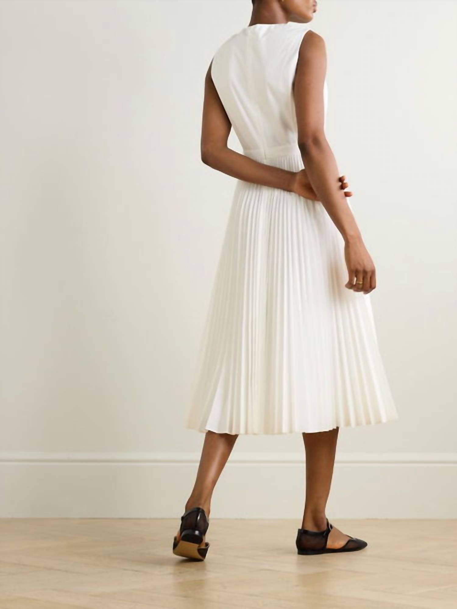 Just add slides or mules and you are good to go. Crafted from 65% polyester and 35% cotton, this sleeveless dress features a structured bodice and a fit-and-flare silhouette that elegantly transitions into a swishy pleated skirt. Made in China, it offers a chic crewneck and a zip closure for easy wear. Care for this piece with dry cleaning to maintain its pristine condition.
