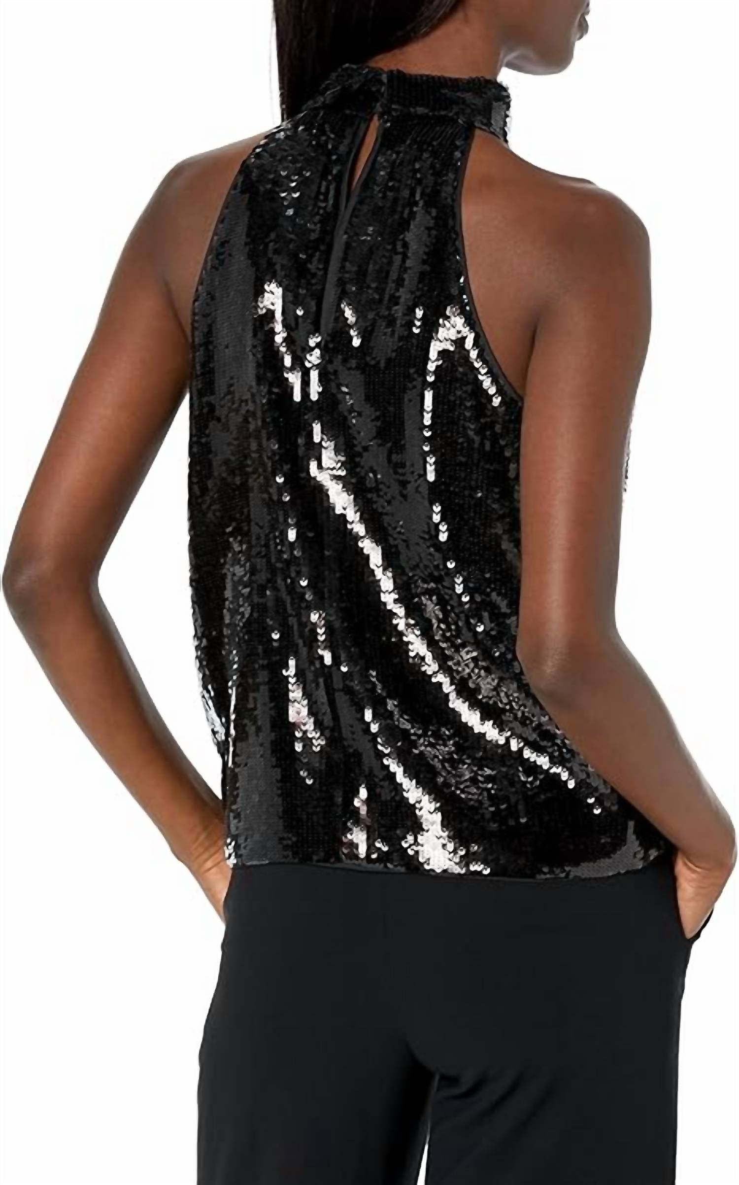 Pair this with your favorite jeans and slides for your next girls night out. This Roll Neck Halter Blouse features a sleek halter neckline, sequined texture, and a button closure at the nape, crafted from 100% recycled polyester for a slim, modern fit.