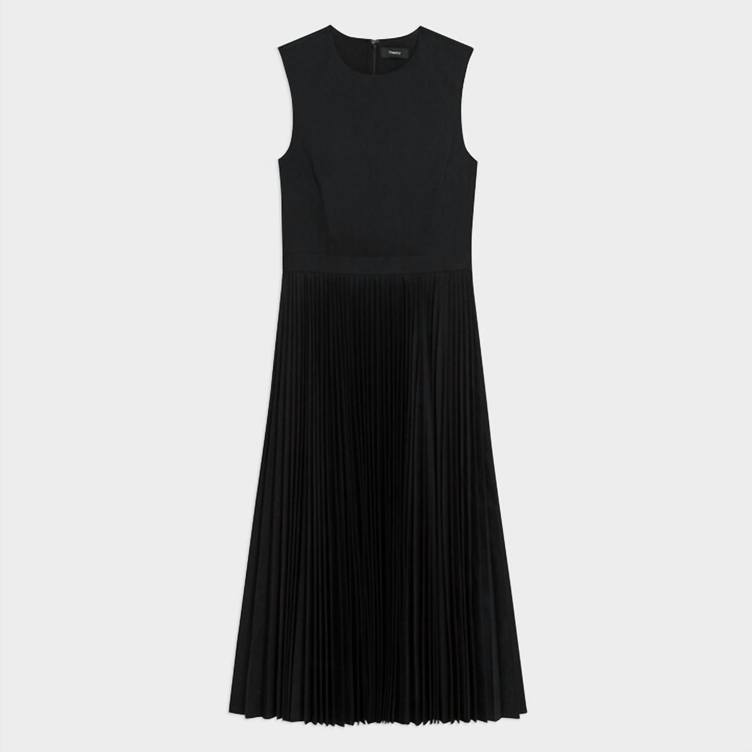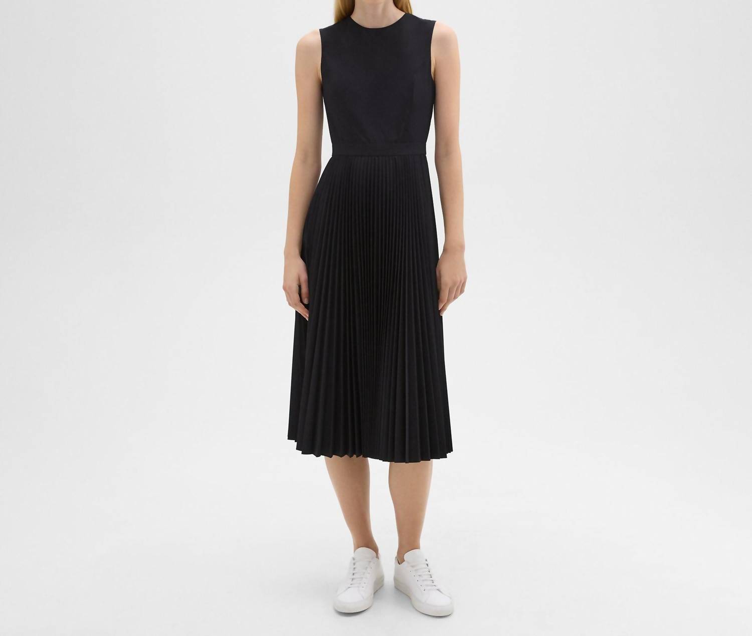 The perfect length dress does exist. The Sleek Poplin Pleated Midi Dress by Theory offers a fresh twist on a classic staple with its intricately pleated design. This fit-and-flare silhouette features a sleeveless bodice crafted from a blend of 65% polyester and 35% cotton poplin, ensuring a clean look and a soft hand. With a below-the-knee length, it comes in a chic black solid pattern, complete with a convenient zip closure and handy pockets. For care, it's recommended to dry clean.