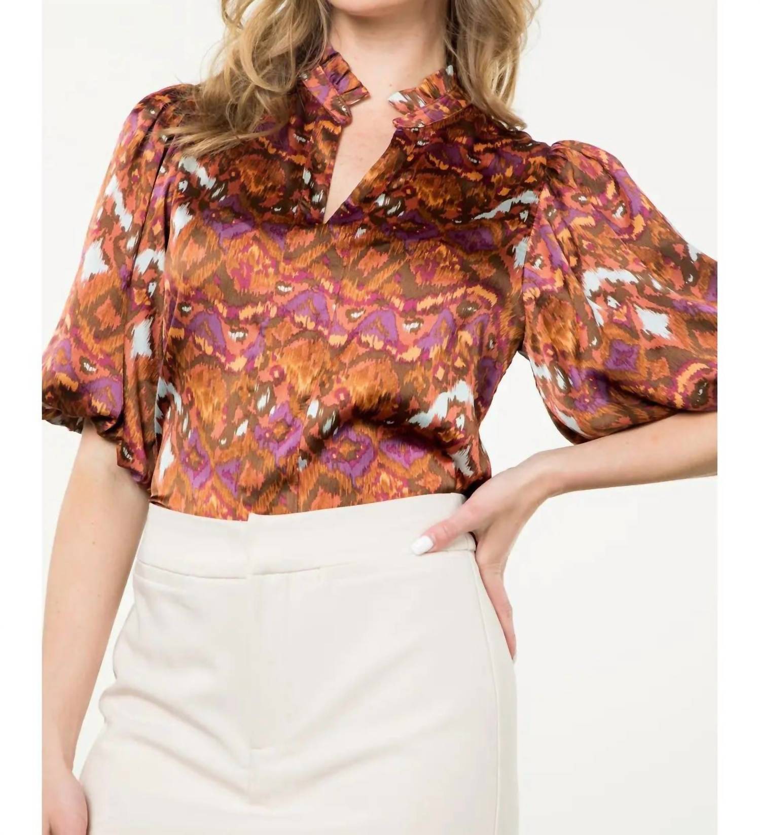 Pair this with your favorite jeans and slides for your next girls night out. Elevate your wardrobe with the Abstract Puff Sleeve Top by THML, a striking piece that blends style and comfort effortlessly. This rust-colored patterned blouse features short puff sleeves and a flattering V-neckline for a touch of elegance. Crafted from polyester, this top offers a pull-on closure for easy wear. Perfect for any occasion, it pairs seamlessly with both casual and formal outfits.