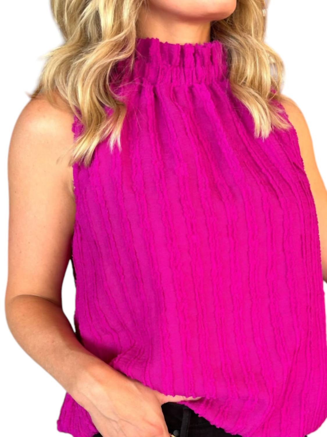 Fit, fabric and functionality. This tank top checks all the boxes. Introducing the Brandy Top by THML, a stylish choice in a playful pink hue designed to elevate your wardrobe. This women's tank top features a unique textured design and a contemporary mockneck, all crafted for a distinct, modern look. With its sleeveless, pull-on design, it ensures ease and comfort. Care is simple with machine wash instructions and lay flat to dry.
