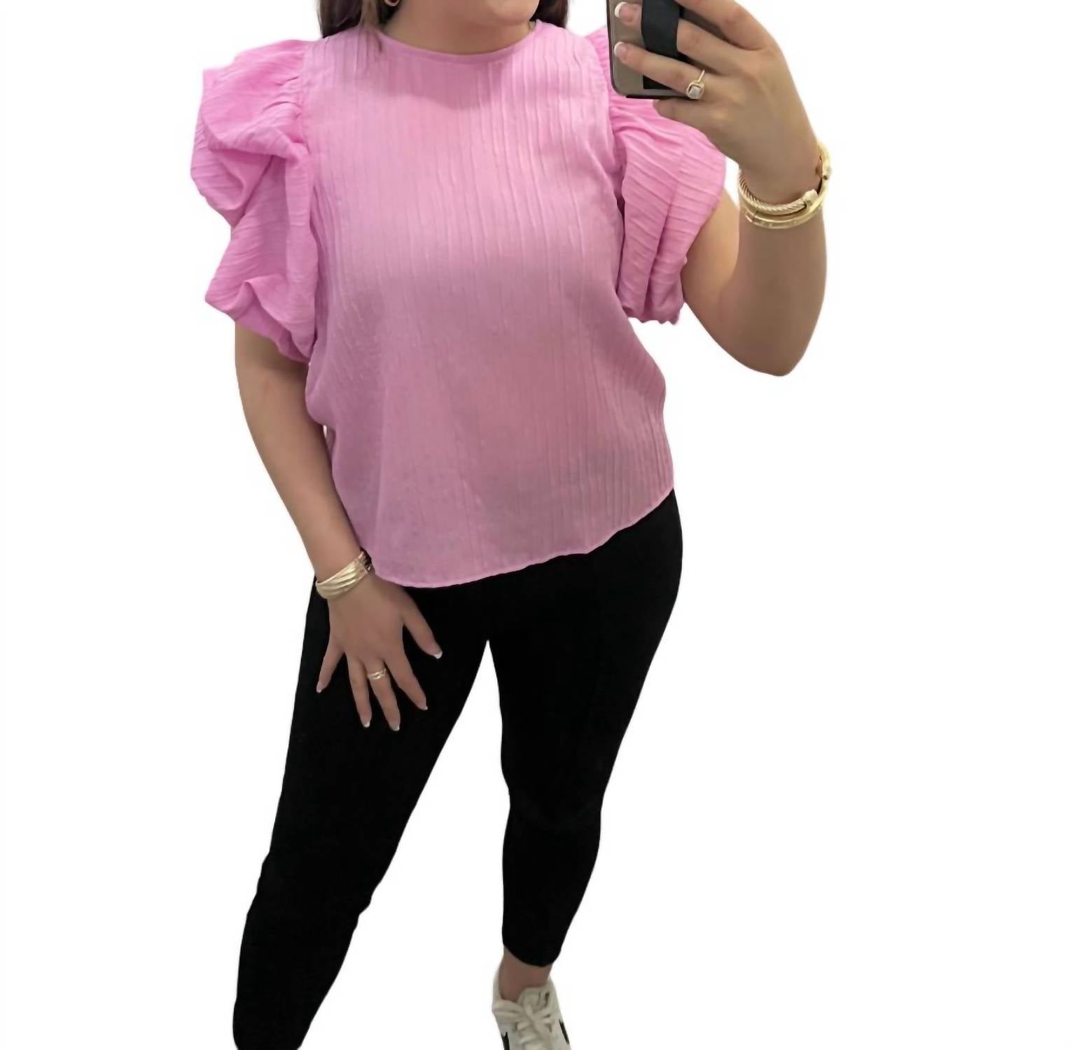 A versatile blouse that works from desk to dinner!Puff Ruffle Sleeve Top. Style Measurements for Size S [Body Length: 23 1/4 in. Bust Width: 36 1/2 in. Sleeve Length: 6 in]. Designed in USA. 55% Rayon, 42% Polyester, 3% Spandex