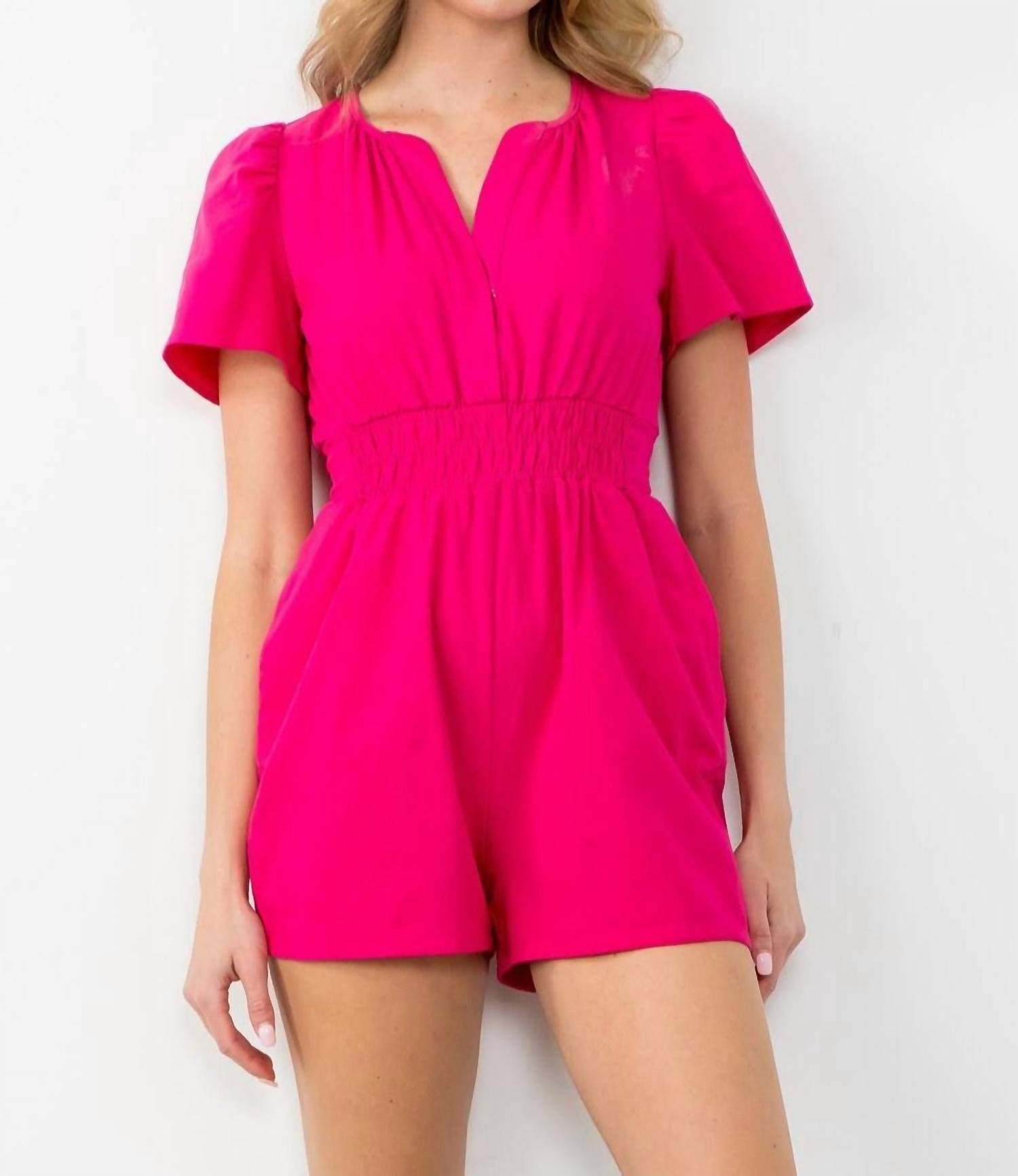Throw it on and go! Elevate your wardrobe with the Smocked Waist Romper by THML, a chic choice in vibrant magenta pink. This romper features slight puff sleeves and functional side pockets, perfectly blending style and convenience. Its smocked waist ensures a comfortable fit, ideal for a minimalist summer look. Closure: Pull on.