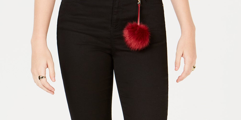 High rise; slim fit through hips and thighs; skinny leg|Approximate inseam: 27"|Front button closure with zipper fly; belt loops|Five-pocket styling; two back patch pockets|Clip-on pompom included; color may vary|Colored wash|Cotton/polyester/viscose/elastane