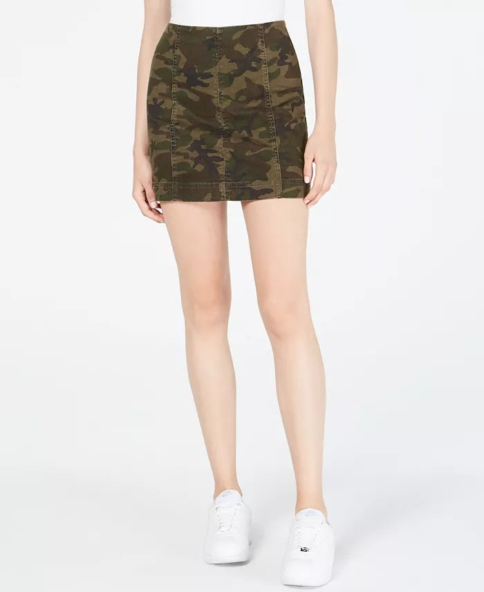 Mini silhouette; hits above knee|Zipper closure at back|Plaid or camo denim skirt; fitted|Cotton/spandex|Machine washable|Imported