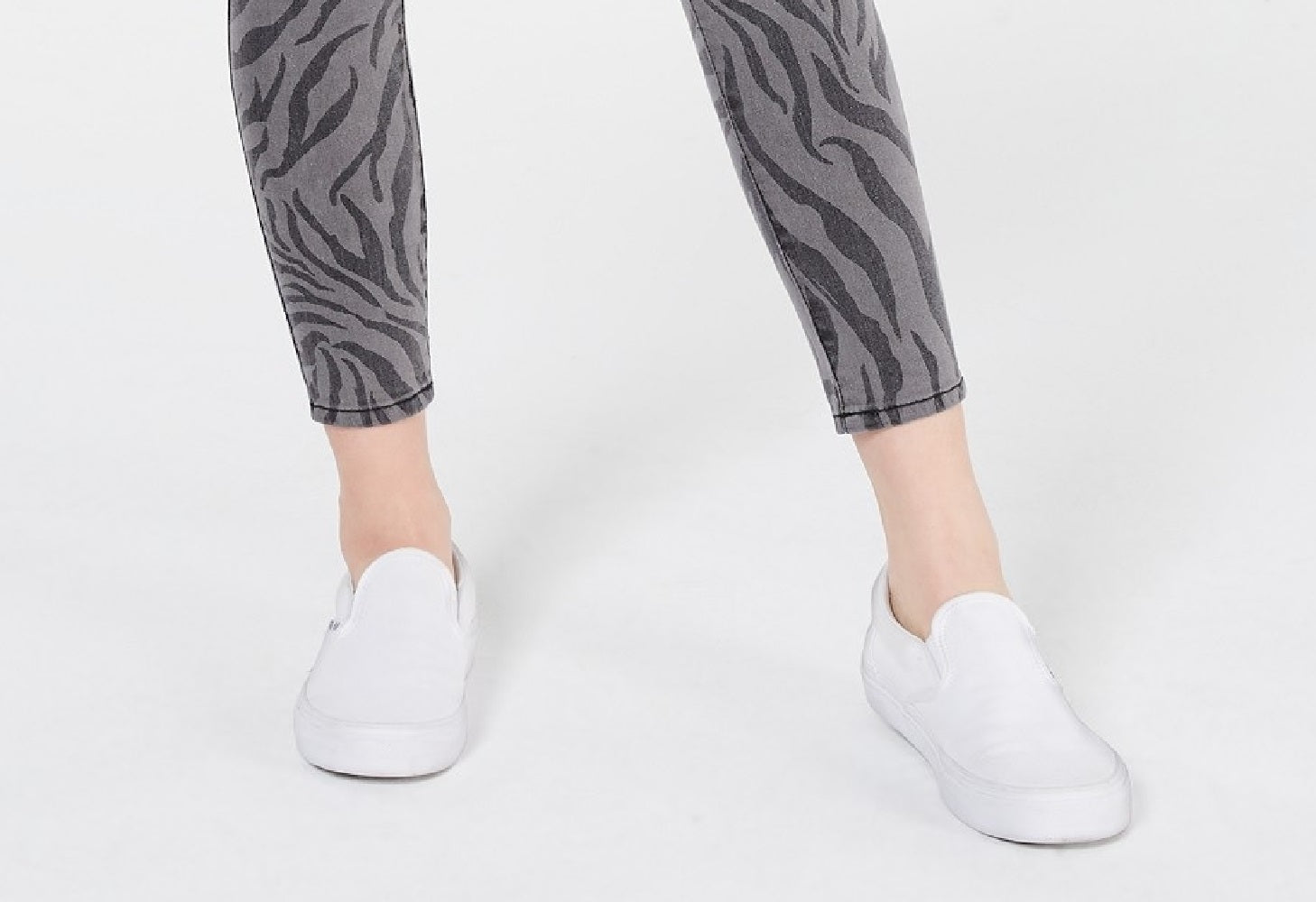 Printed zebra wash | Zipper and button closure at front; belt loops | Cotton/polyester/viscose/elastane