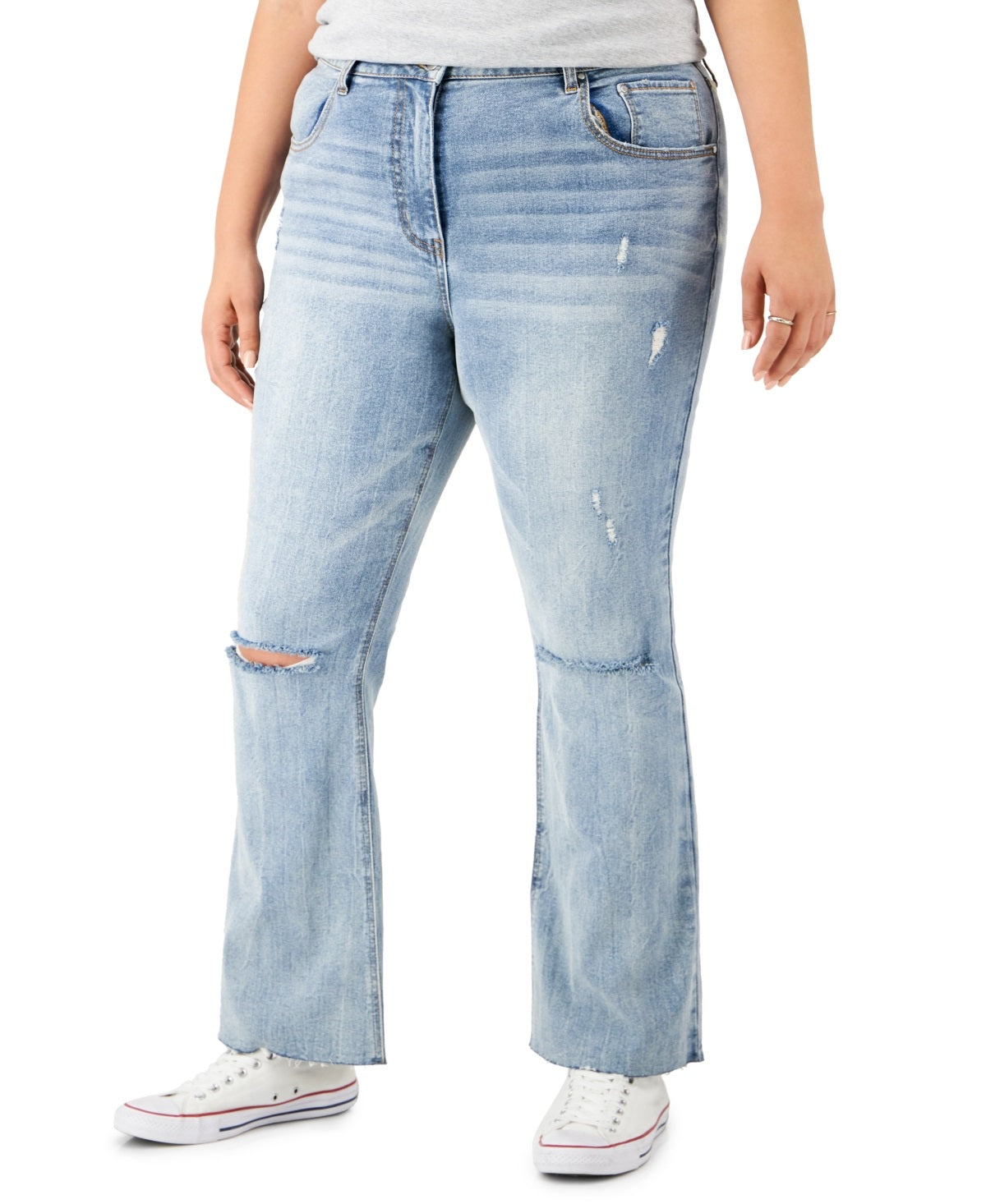 The lightly lived-in look of these Tinseltown plus size flared jeans will see you through the season with a modern high rise.| Approx. inseam; 31| High rise; approx. 13 at front; flared leg opening; 22-1/4| Zipper and button closure at front fly; belt loops| Light distressed detailing and rips; raw hemline| Cotton/spandex| Machine washable