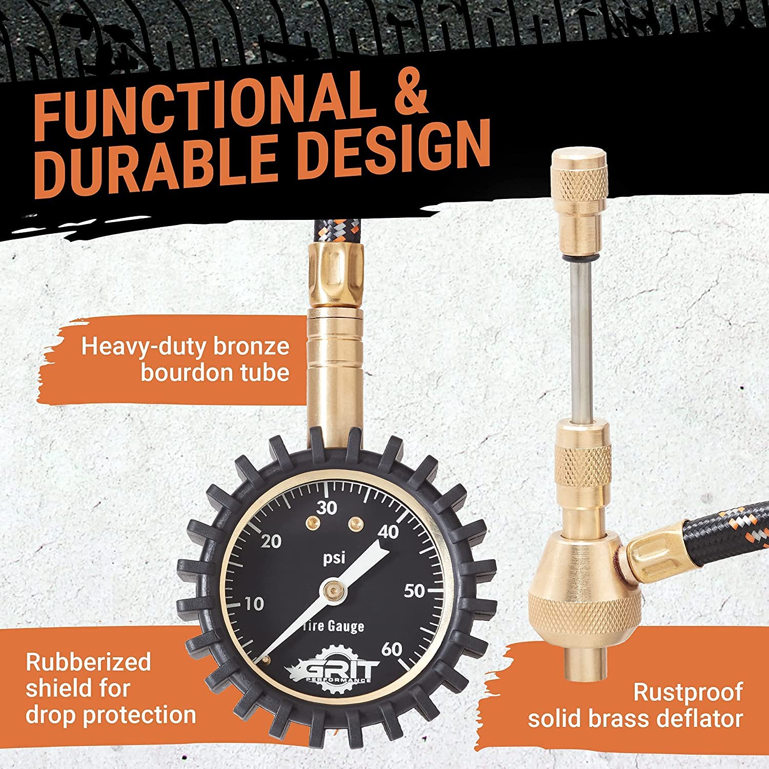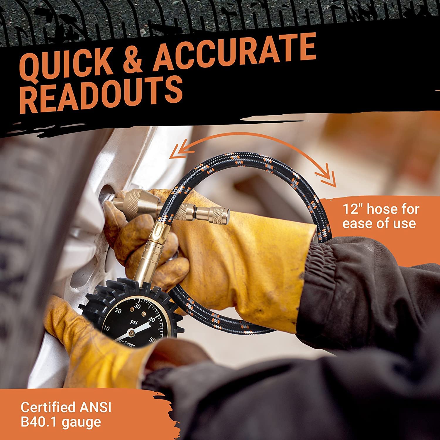 • 【Designed for Precision】Highly calibrated accurate to ±1% full scale of 60 PSI range, our tire gauge has an accurate pressure reading & a glow-in-the-dark face.