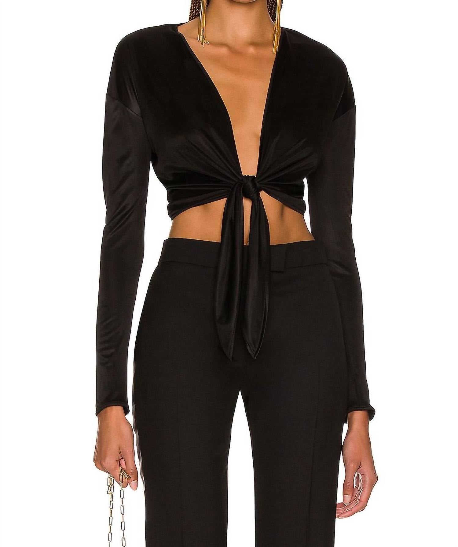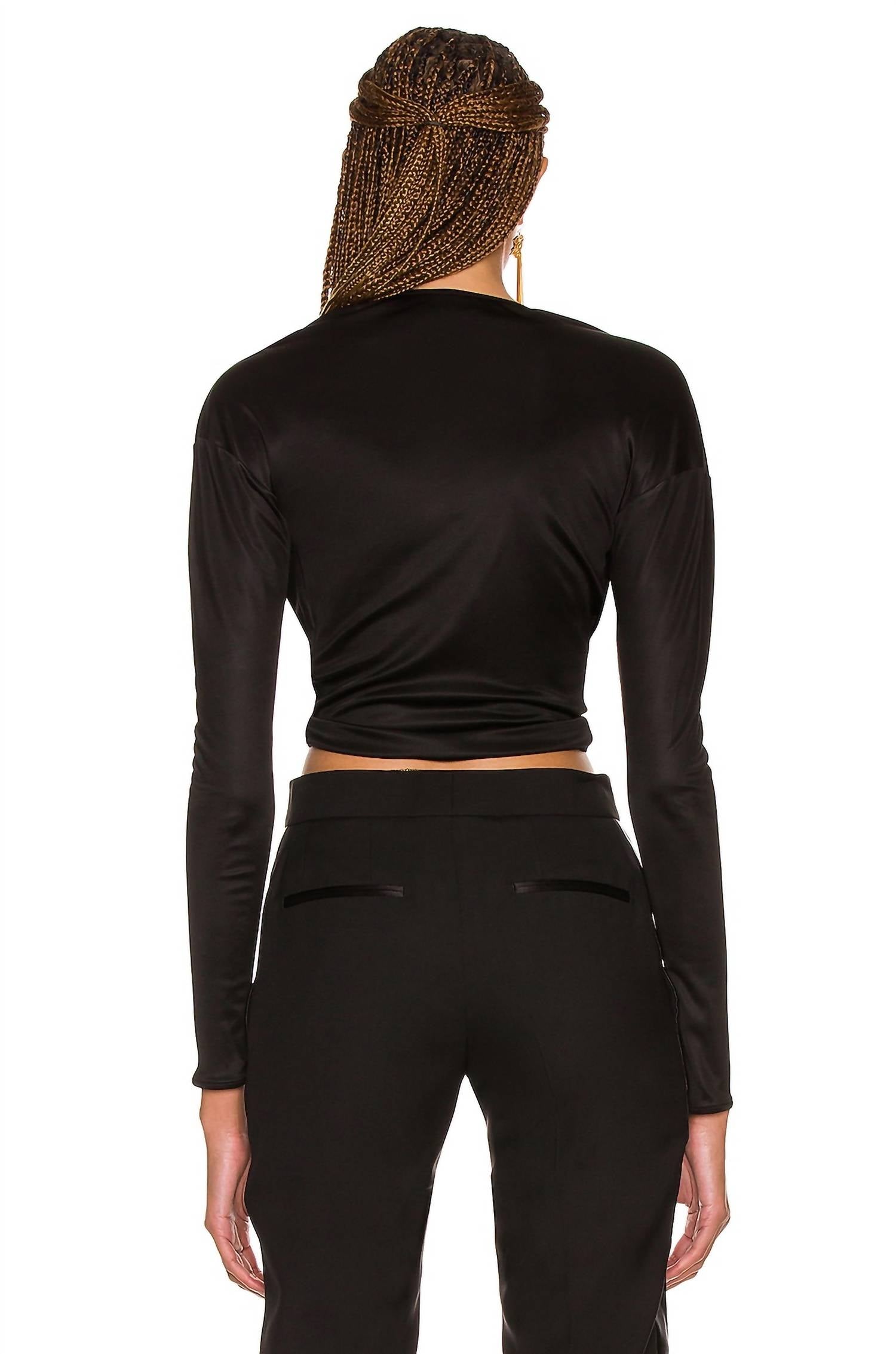 Elevate your wardrobe with the Slick Wrap Top by Tom Ford, a stunning piece perfect for any occasion. This crop top features long sleeves and is crafted from 100% viscose, offering a slinky feel and a solid black hue. Made in Italy, it includes a front tie closure for added elegance and a V-neckline for a flattering fit. Care for this luxurious top by adhering to dry clean instructions.