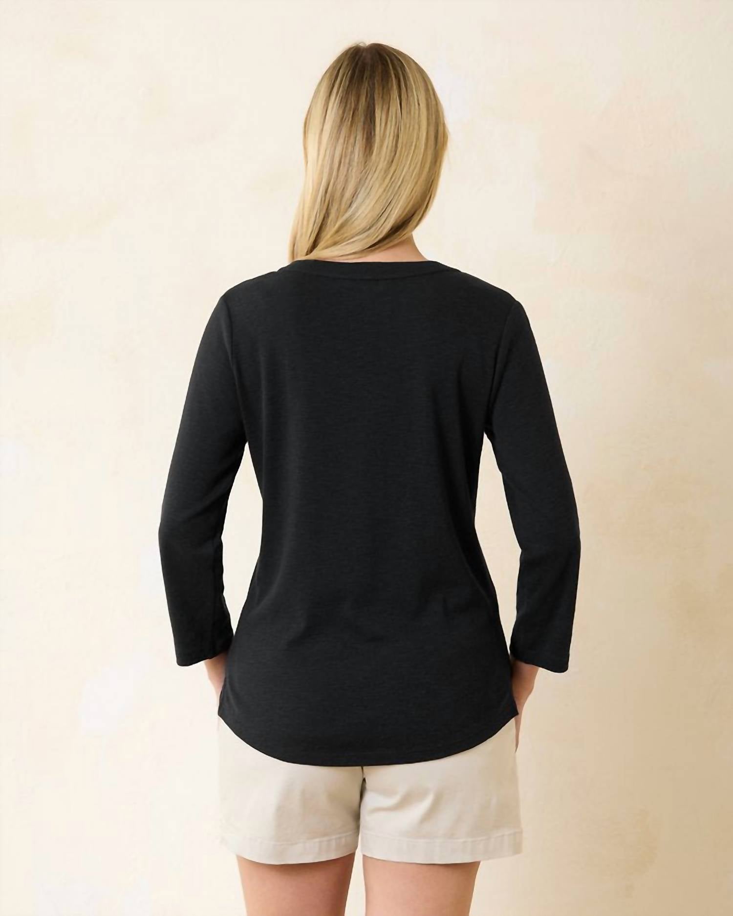Great fit, cute design, soft fabric. You'll love everything about this long sleeve tee. Discover the ultimate wardrobe staple with the Three Quarter Sleeve Tee by TOMMY BAHAMA. This softly constructed tee features long sleeves and is composed of 100% cotton, ensuring comfort and breathability. Its chic scoop-neck silhouette and slight high-low hem create a flattering profile, with a back length of 26" from shoulder to hem in size S. Imported and designed for easy care, simply machine wash cold with like colors, use non-chlorine bleach, tumble dry low, and cool iron if necessary.