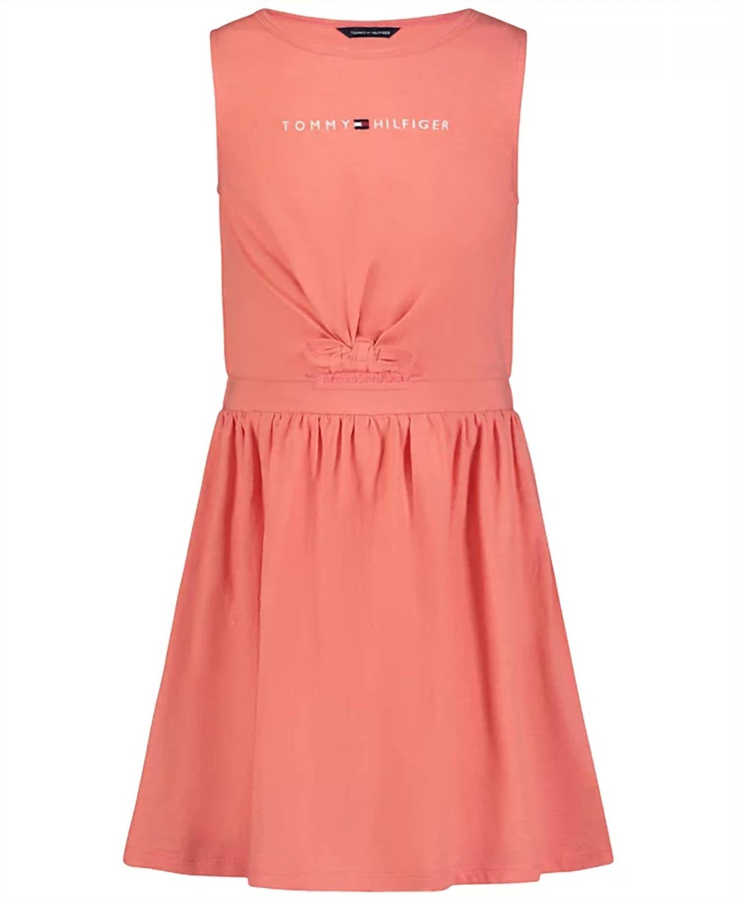 Introducing the Big Girls Embroidered-logo Sleeveless Dress by Tommy Hilfiger, a charming addition in Peach Dusk that radiates playful elegance. This dress is sleeveless and crafted from a soft cotton blend, featuring an eye-catching embroidered logo and a delightful keyhole twist-tie detail at the front. The garment pulls on effortlessly and showcases a banded waist leading to a flared skirt for a comfortable fit. Care: Machine washable for easy maintenance. Perfect for casual occasions.
