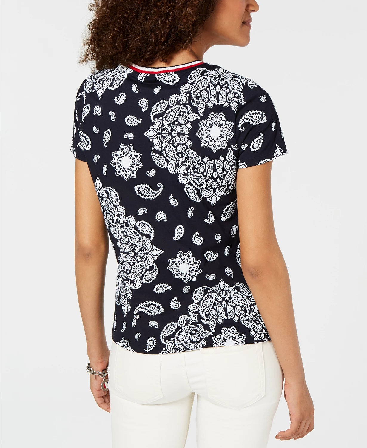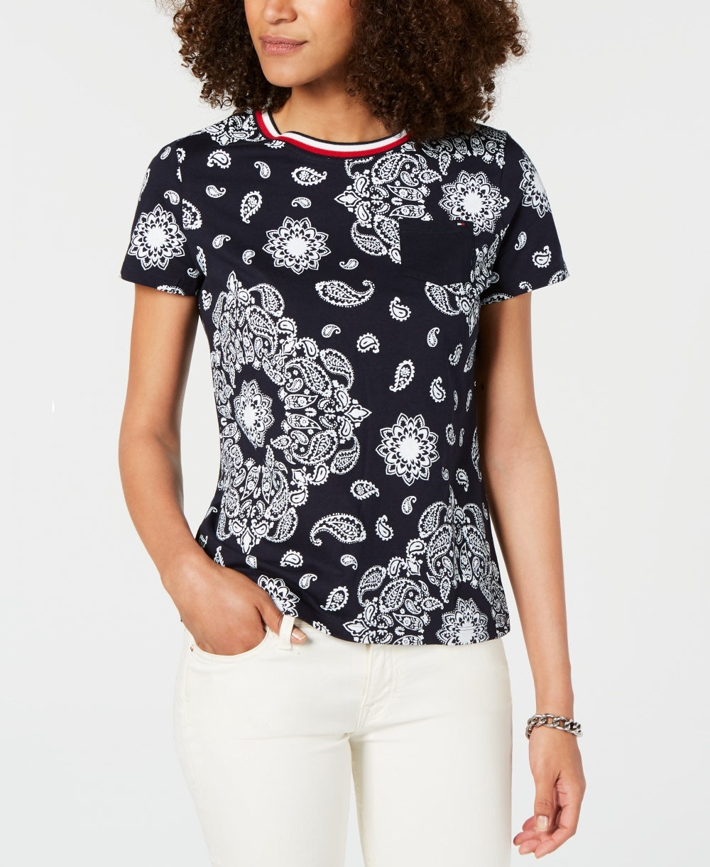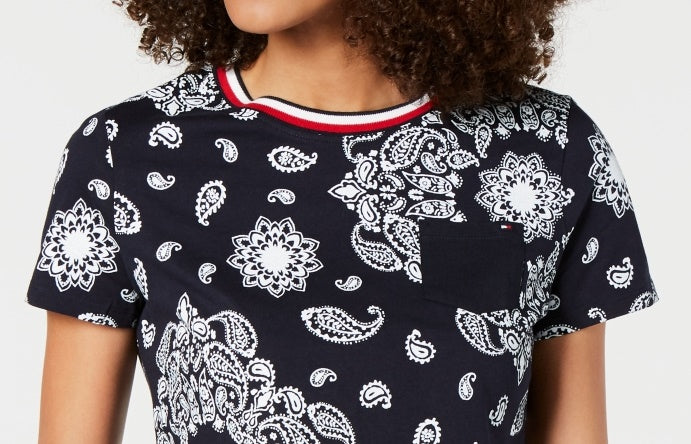 Tommy Hilfiger Women's Cotton Printed Striped Neck Top Blue Size Large