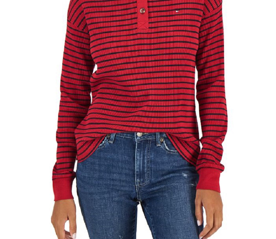 Tommy Hilfiger Women's Long Sleeve Striped Boxy Henley Top Red