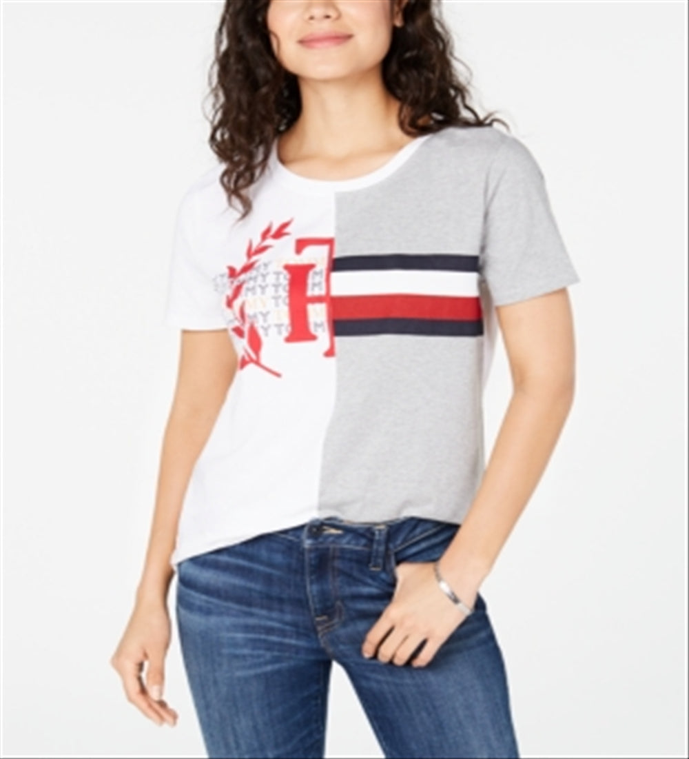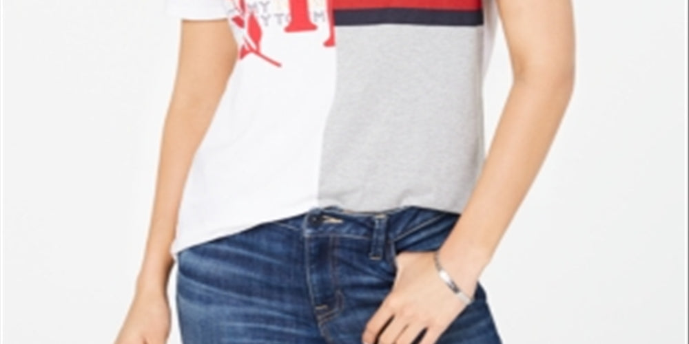 Tommy Hilfiger Women's Multi Short Sleeve Spliced Logo T-Shirt White Size M
