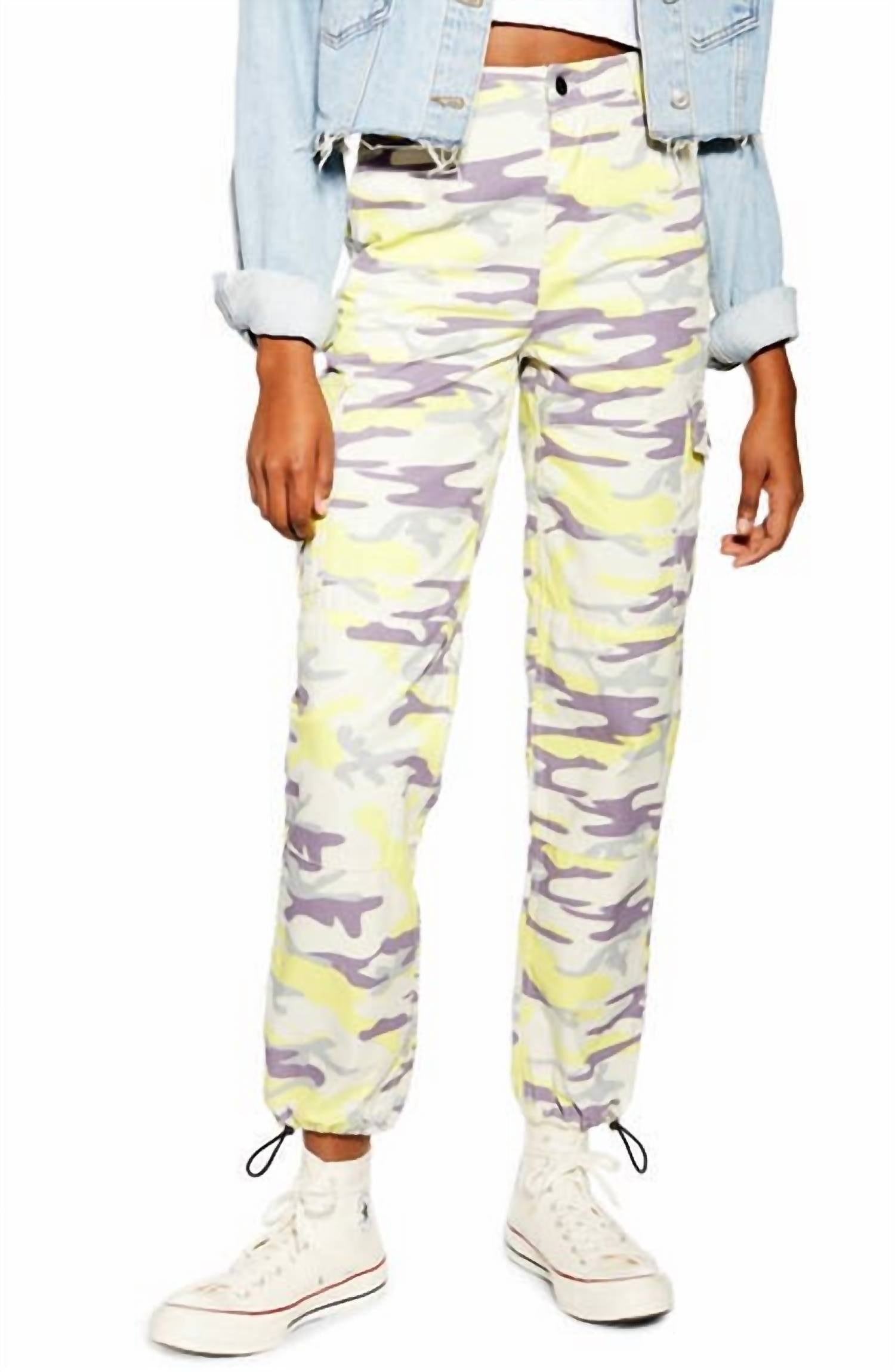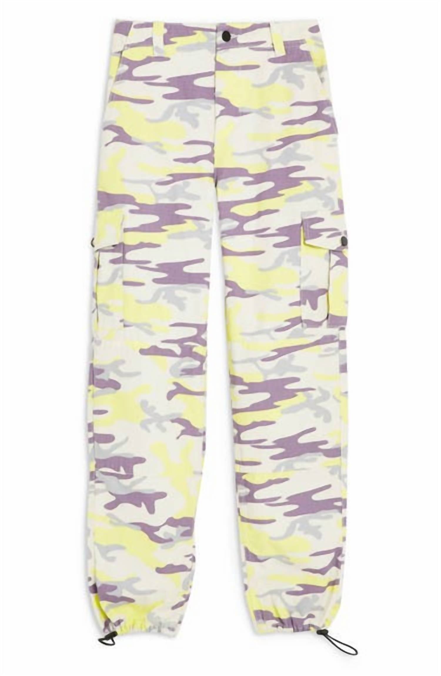 Pair these with your favorite sneakers for an effortlessly cool look. Stand out in these vibrant camo pants styled with handy pockets and cropped drawstring hems Zip fly with button closure Side pockets; side flap pockets; back flap pockets Drawstrings at cuffs 100% Cotton Machine Wash Inseam 29.5"