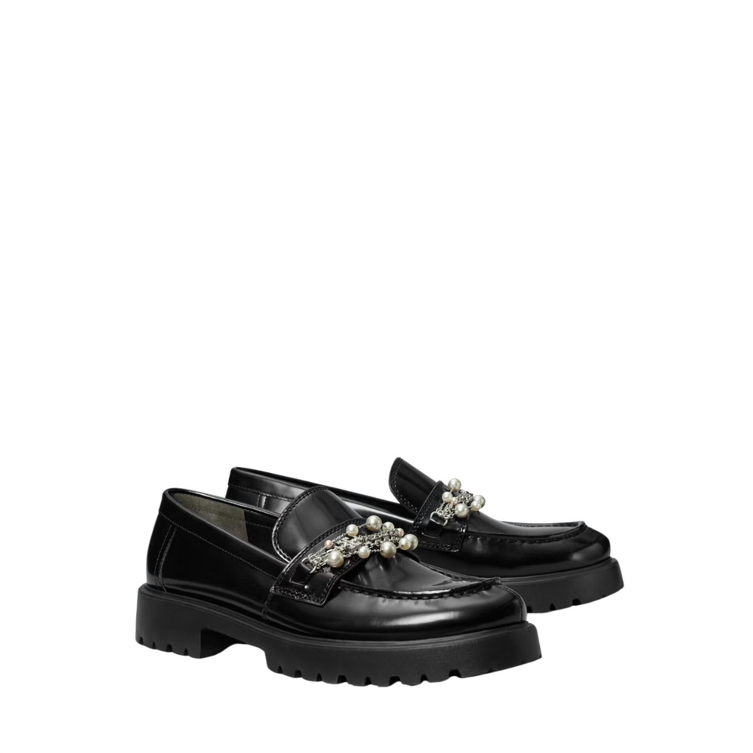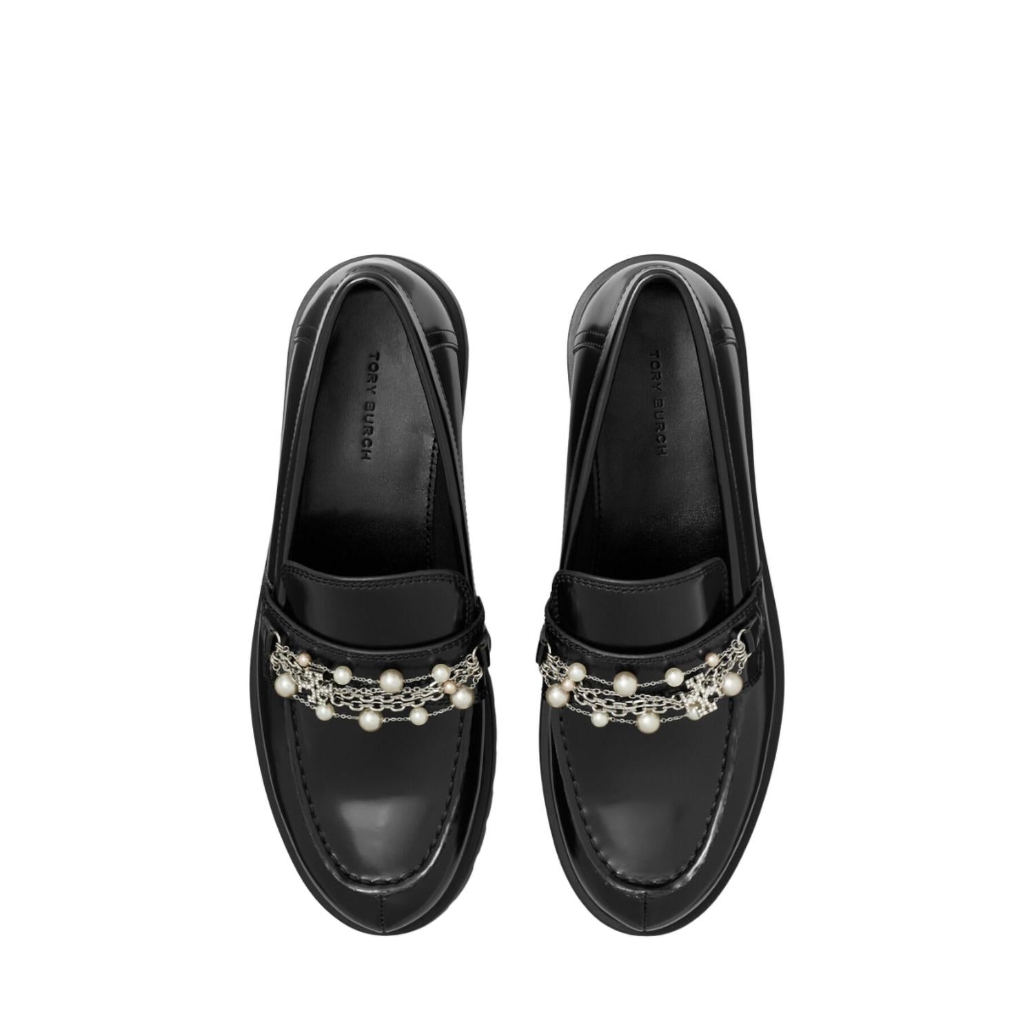 A preppy yet feminine take on the classic loafer. Decorative pearl and pavé chains and a light-as-air exaggerated lug sole update the classic silhouette with a modern identity that is both masculine and hyper-feminine. Featuring a delicate Double T and a cushioned footbed, the elevated loafer is perfect to add a slight lift and jewelry-like embellishment into the everyday wardrobe. Runs slightly small, we recommend ordering ½ size up if you are between sizes Calf leather upper Pearl and pavé chain Cushioned leather footbed Napa leather lining EVA lug sole Avoid moisture exposure and handle with care to ensure the longest life of your shoe. Clean with a dry cloth and store in the dust bag.