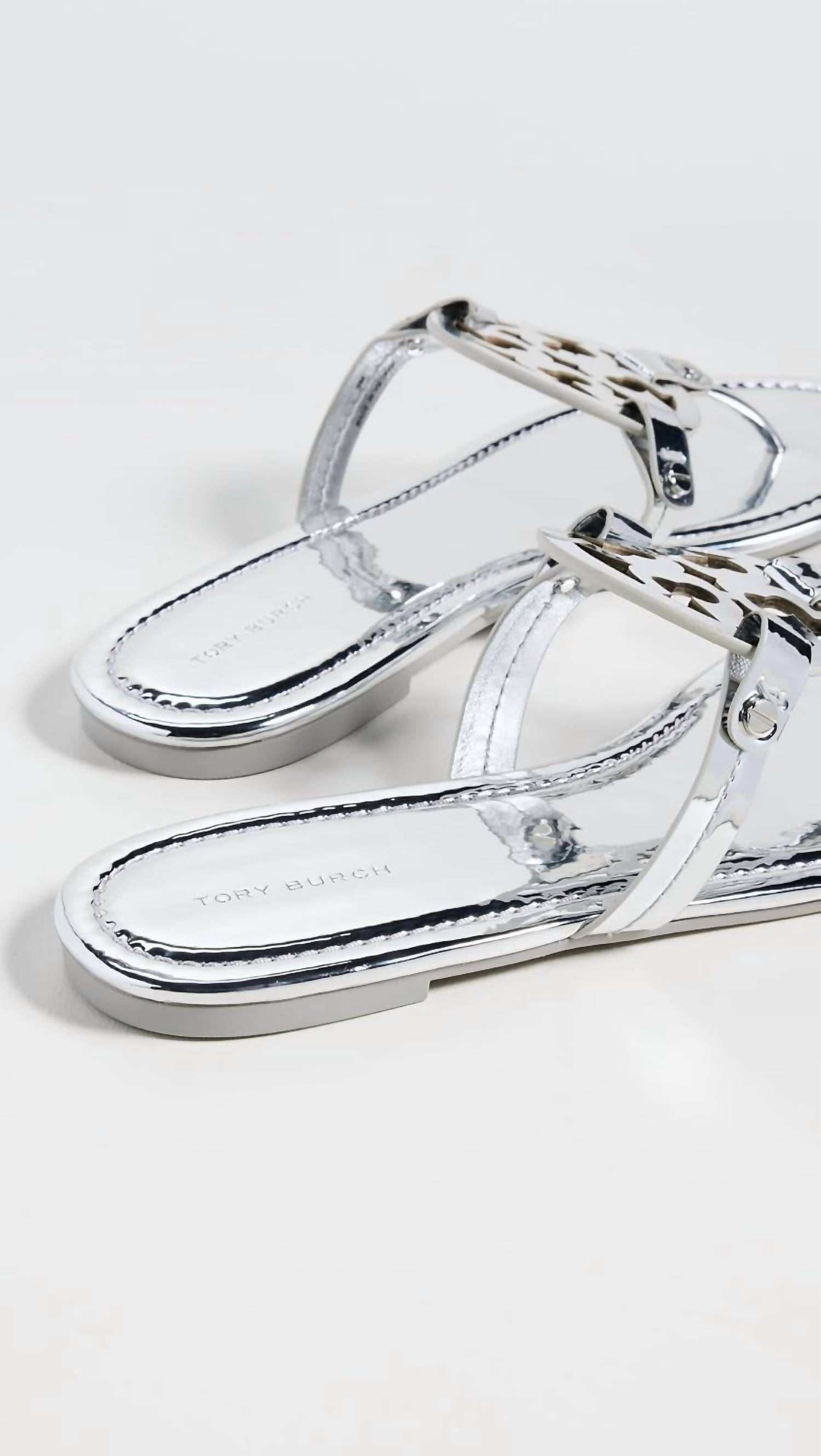 Flowy dresses, cropped pants, and even jumpsuits... this sandal works with them all! Step into style with the Women's Argento Miller Logo Slides Sandals by Tory Burch, an ideal choice for a chic summer ensemble. These sandals feature a comfortable open toe design with a sleek mirrored metallic finish, complete with a thong strap adorned by a statement logo. The construction includes durable rubber for both the sole and outer material, ensuring long-lasting wear. With a convenient pull-on closure and a flat heel height of 1" & under, these imported sandals are perfect for a relaxed beach day or an outing in the city.