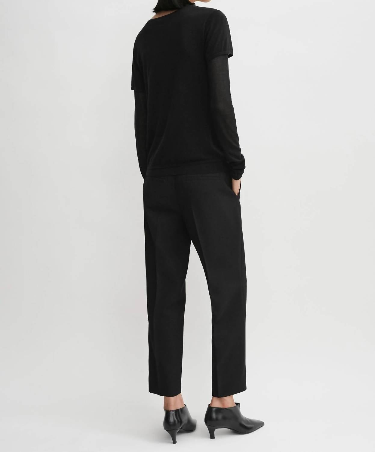 The perfect long sleeve tee that goes with just about anything. Experience timeless style with TOTEME's Layered Knit Long Sleeved Top Tee, a minimalist solid black piece perfect for any occasion. This finely knitted top offers standard sizing with a crew neckline and gives the illusion of a T-shirt layered over long sleeves. Expertly crafted from 88% Lyocell, 10% Cashmere, and 2% Polyamide, it features a convenient pull-on closure. Care instructions recommend machine washing and laying flat to dry, ensuring effortless maintenance.