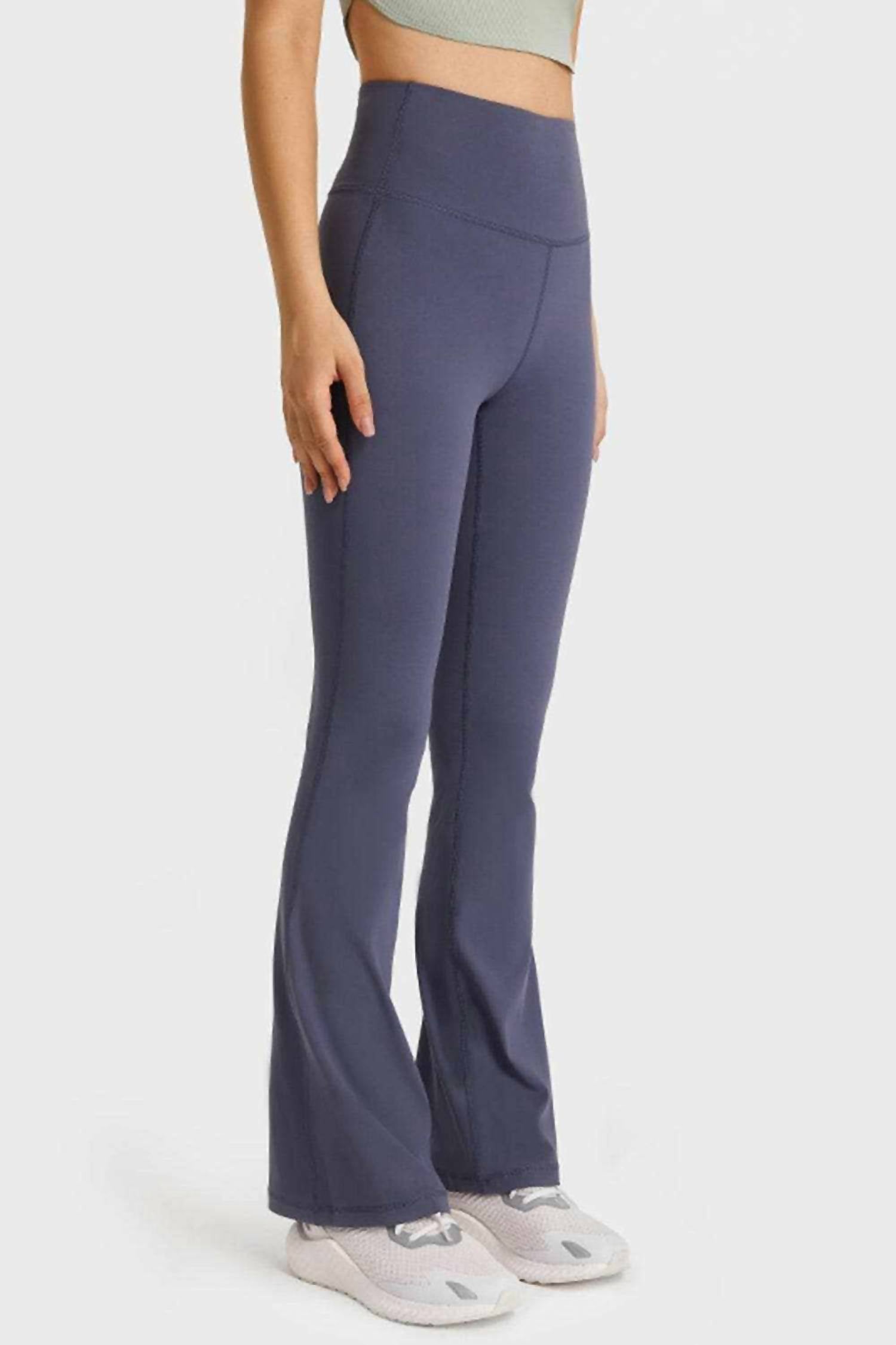 Crafted for both comfort and style in any active setting. Women's high-rise pants feature a solid pattern with a stretchy, flared leg design for unrestricted movement. Made from a premium blend of 80% nylon and 20% spandex. Offer a soft, second-skin feel. Closure is easy with a pull-on design. Hand wash cold and avoid tumble drying to maintain quality.