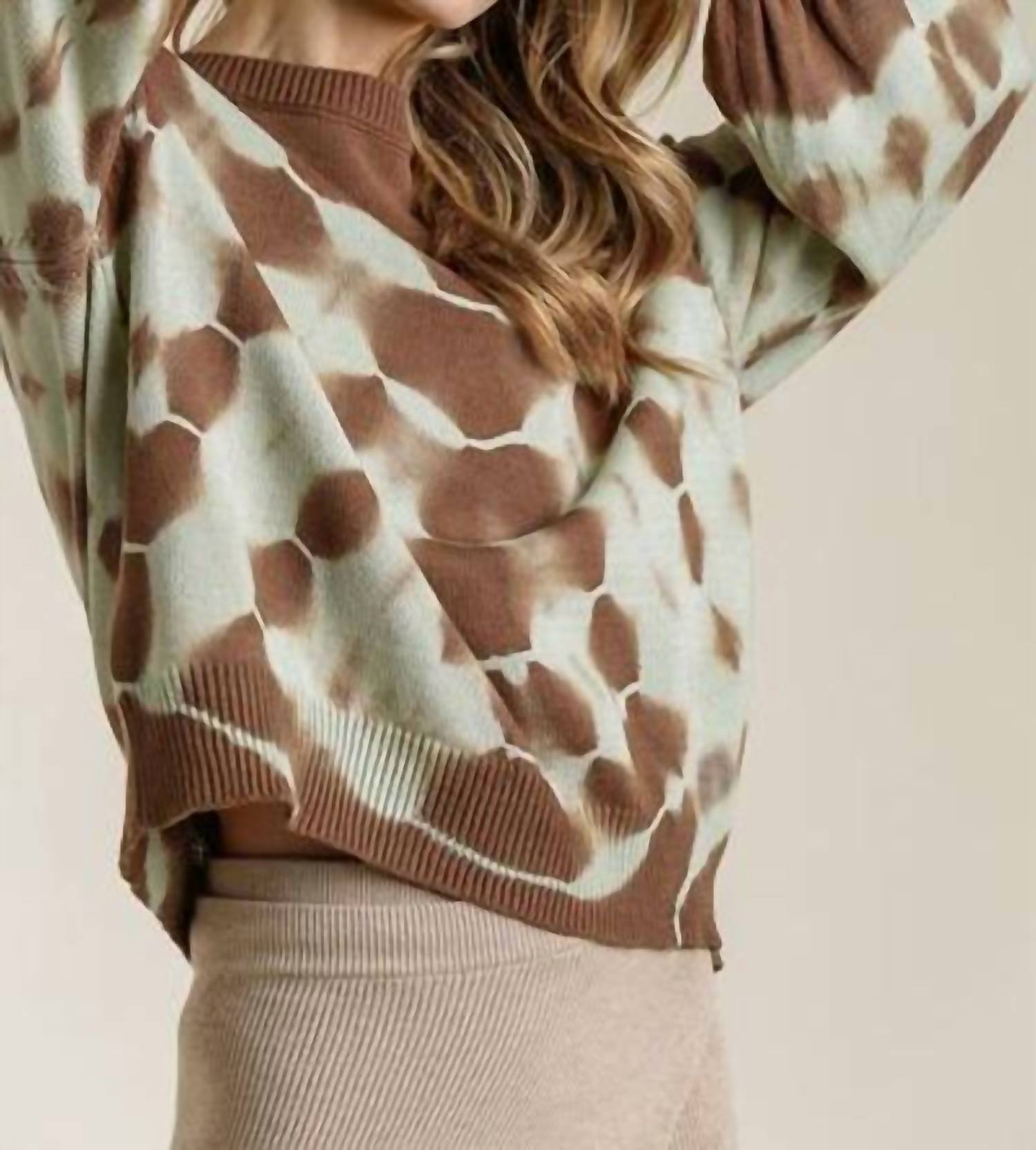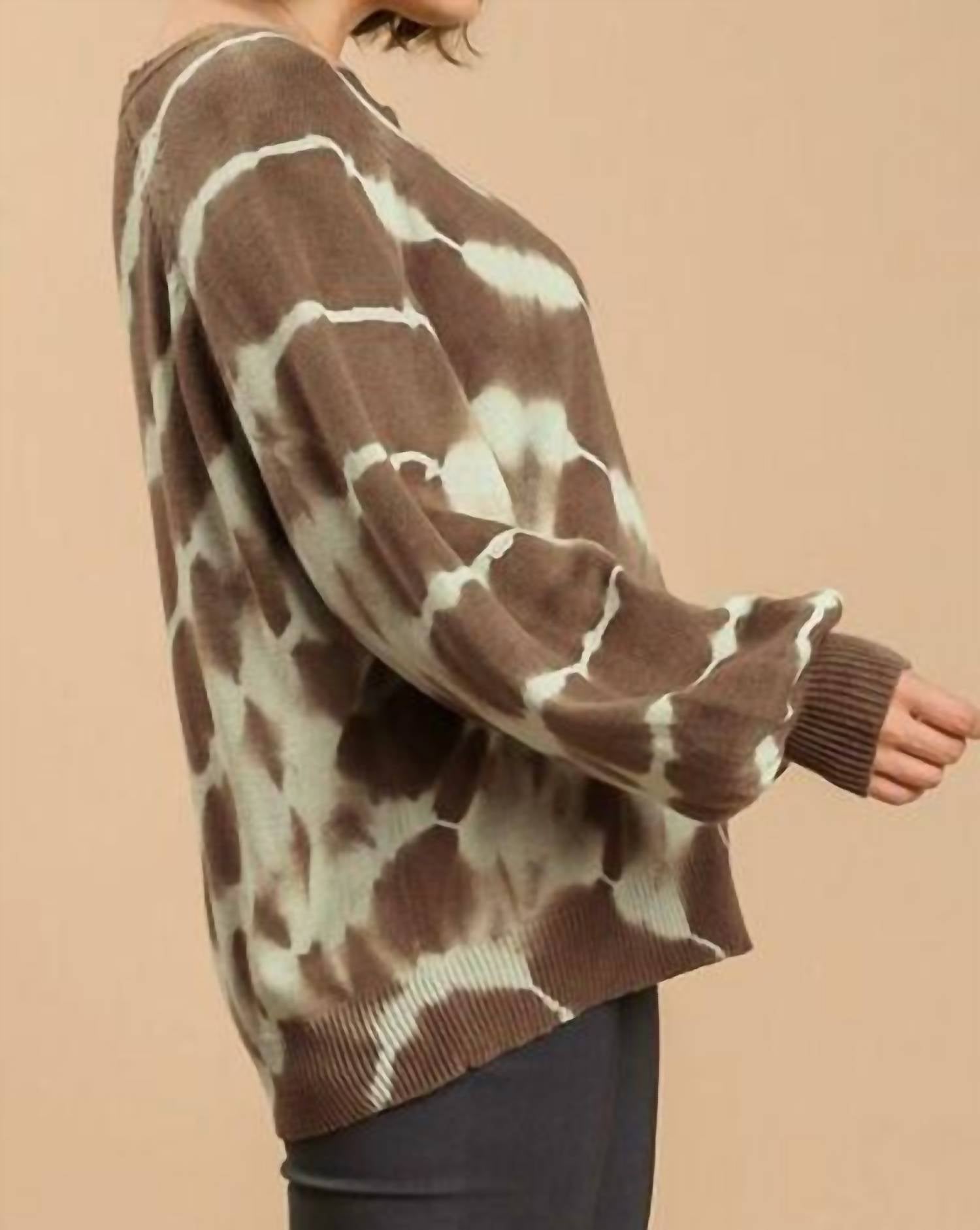 This cardigan will be a sweater-rotation favorite. Elevate your casual wardrobe with the Umgee Full Size Ribbed Hem Tie Dye Round Neck Sweater Plus Size by Trendsi, perfect for travel or spring outings. This long sleeve sweater is crafted from a cotton blend comprised of 60% cotton and 40% acrylic, offering a slightly stretchy and cozy fit. It features a boatneck design and a playful coffee brown tie-dye pattern with a ribbed hem for added texture. Closure is pull-on, and caring for this imported piece is easy with machine wash cold and low tumble dry instructions. Available in a range of sizes, from S (Bust 34-36 in, Waist 26-28 in) to 2XL (Bust 45 in, Waist 38 in).