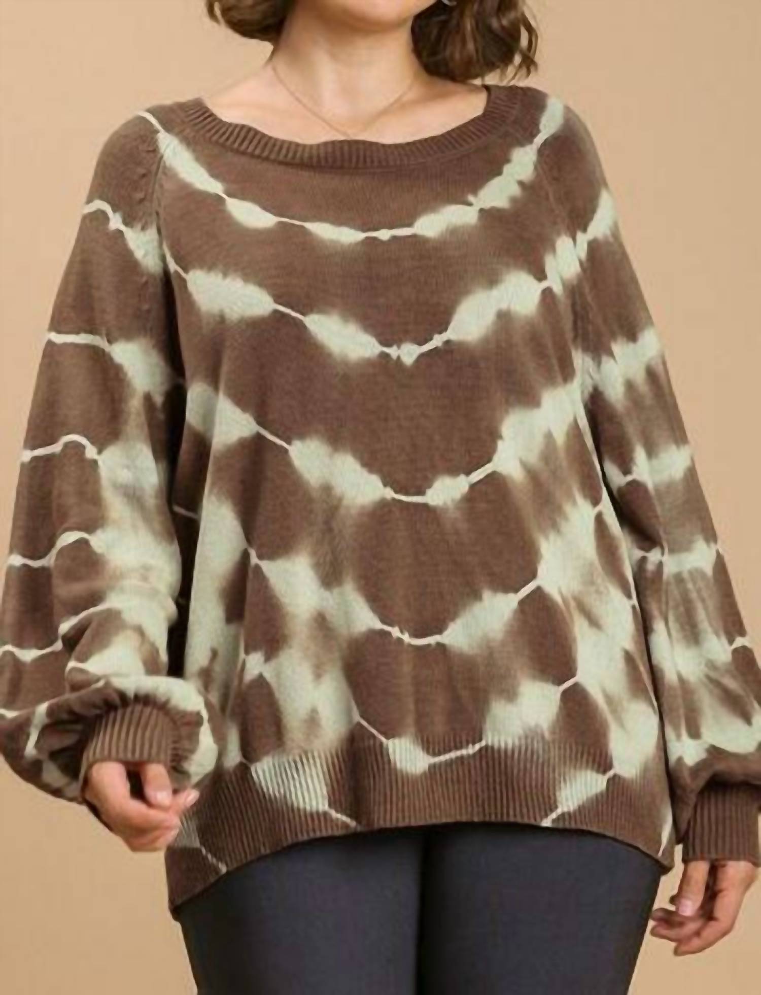 Elevate your casual wardrobe with the Umgee Full Size Ribbed Hem Tie Dye Round Neck Sweater Plus Size by Trendsi, perfect for travel or spring outings. This long sleeve sweater is crafted from a cotton blend comprised of 60% cotton and 40% acrylic, offering a slightly stretchy and cozy fit. It features a boatneck design and a playful coffee brown tie-dye pattern with a ribbed hem for added texture. Closure is pull-on, and caring for this imported piece is easy with machine wash cold and low tumble dry instructions. Available in a range of sizes, from S (Bust 34-36 in, Waist 26-28 in) to 2XL (Bust 45 in, Waist 38 in).